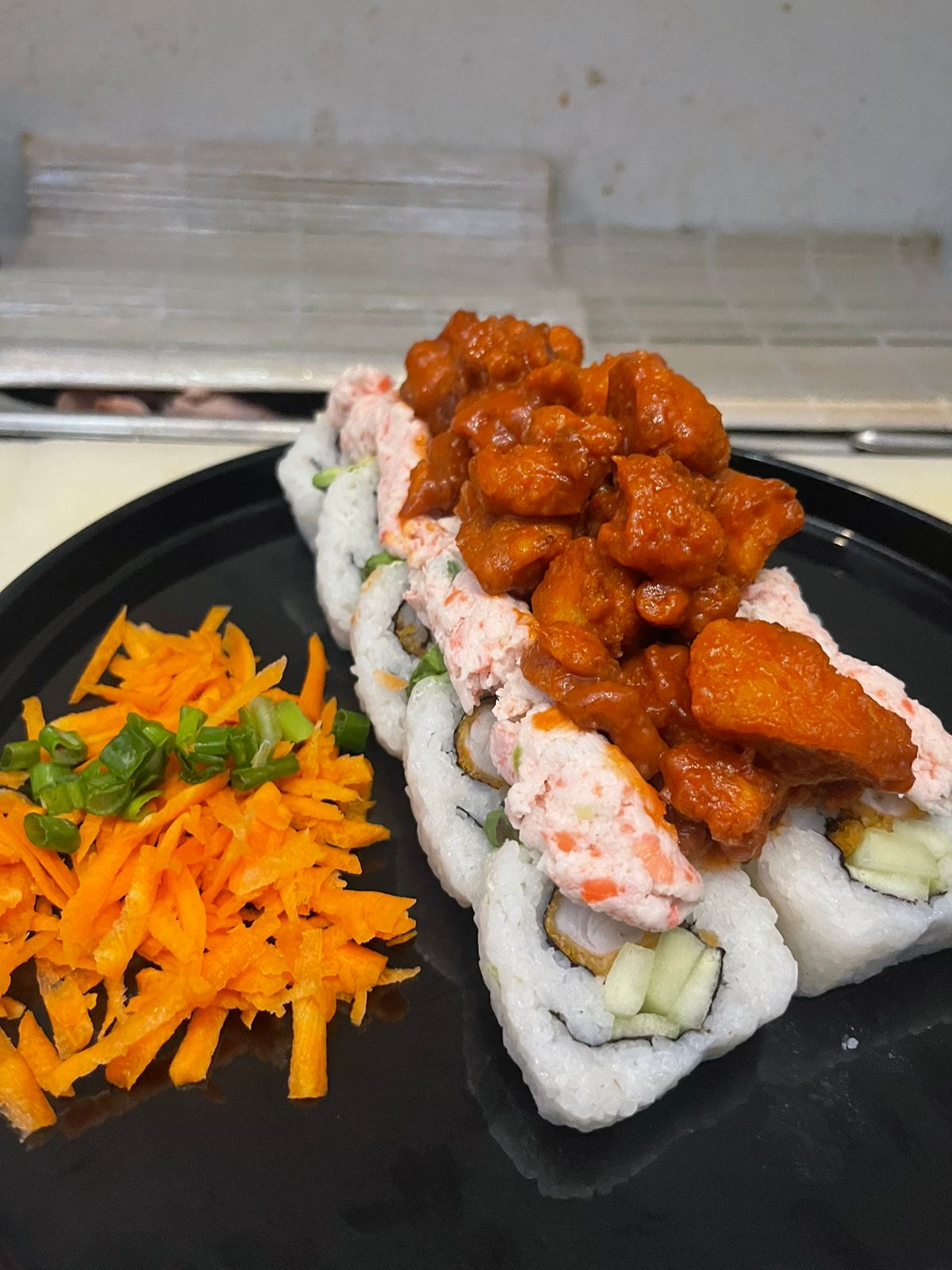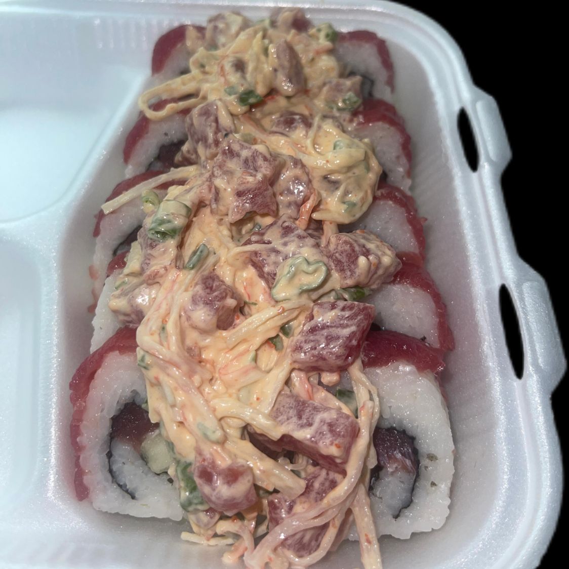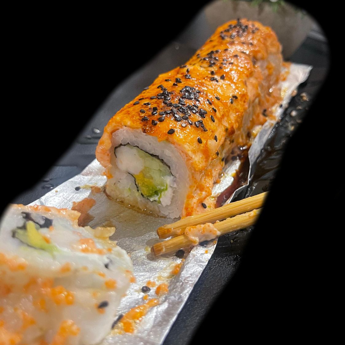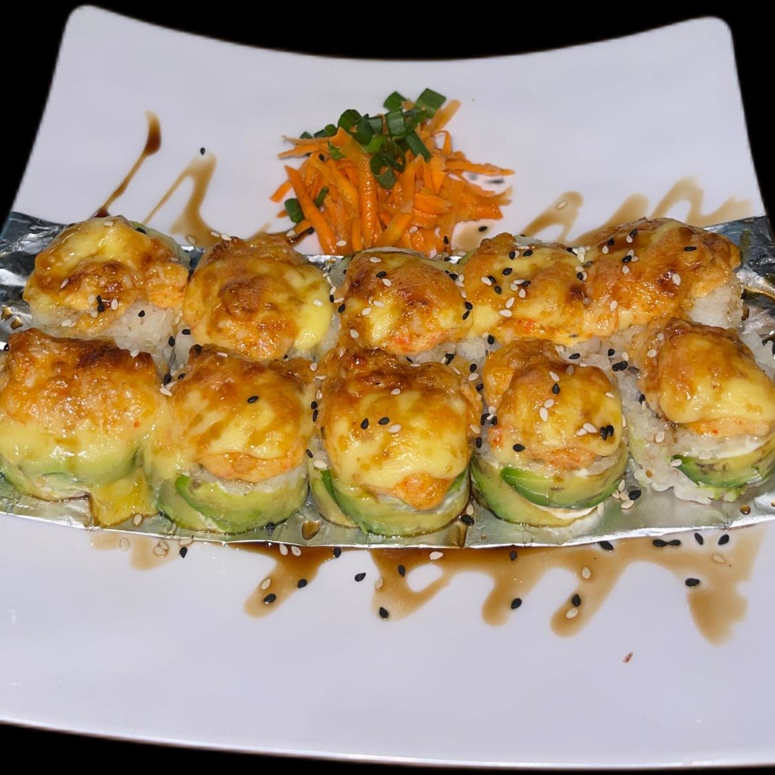 Por dentro: Philadelphia, pepino y surimi Por fuera: Philadelphia y aguacate Encima: spicy de camarón con salmón coronado con anguila y Ajonjoli