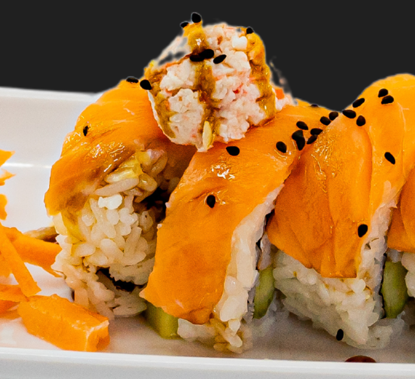 Por dentro: Philadelphia, aguacate, pepino y camaron Por fuera: forrado de salmón, bañado en aderezo de massago