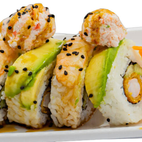 Por dentro: Philadelphia, aguacate y camarón Por fuera: forrado de aguacate Encima: Kanikama coronado de camarón empanizado y anguila