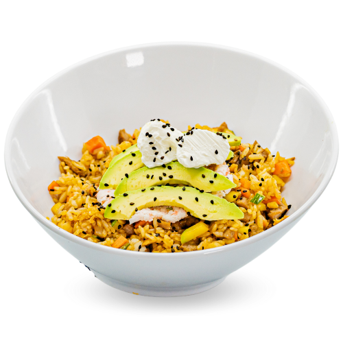 Arroz frito con zanahoria, calabaza, res, pollo, camarón, tampico, aguacate, philadelphia y ajonjolí.