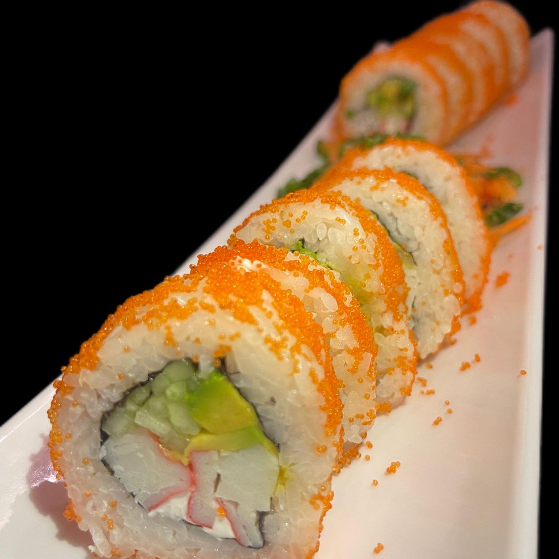 Por dentro: Philadelphia, aguacate, pepino y camaron Por fuera: massago Encima: tampico