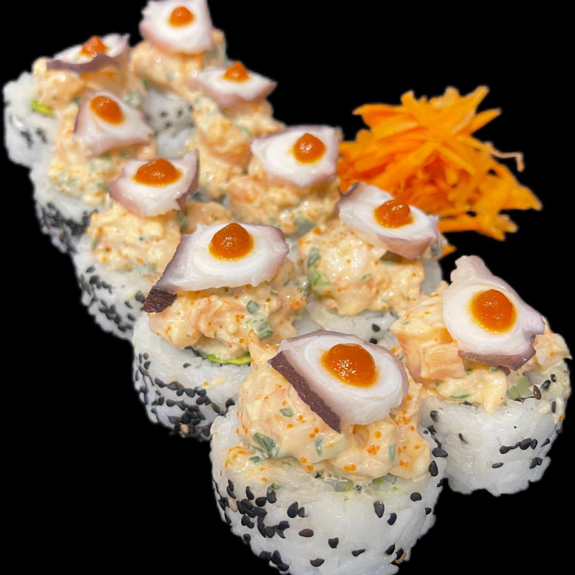 Por dentro: Philadelphia, camarón y aguacate Por fuera: Ajonjoli y topping de camarón con massago coronado con pulpo y sriracha