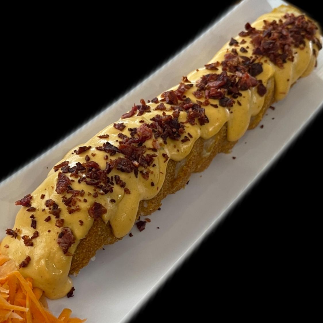 Philadelphia, aguacate y camarón por dentro, queso gratinado con tocino por fuera, tampico, aderezo chipotle y anguila encima.