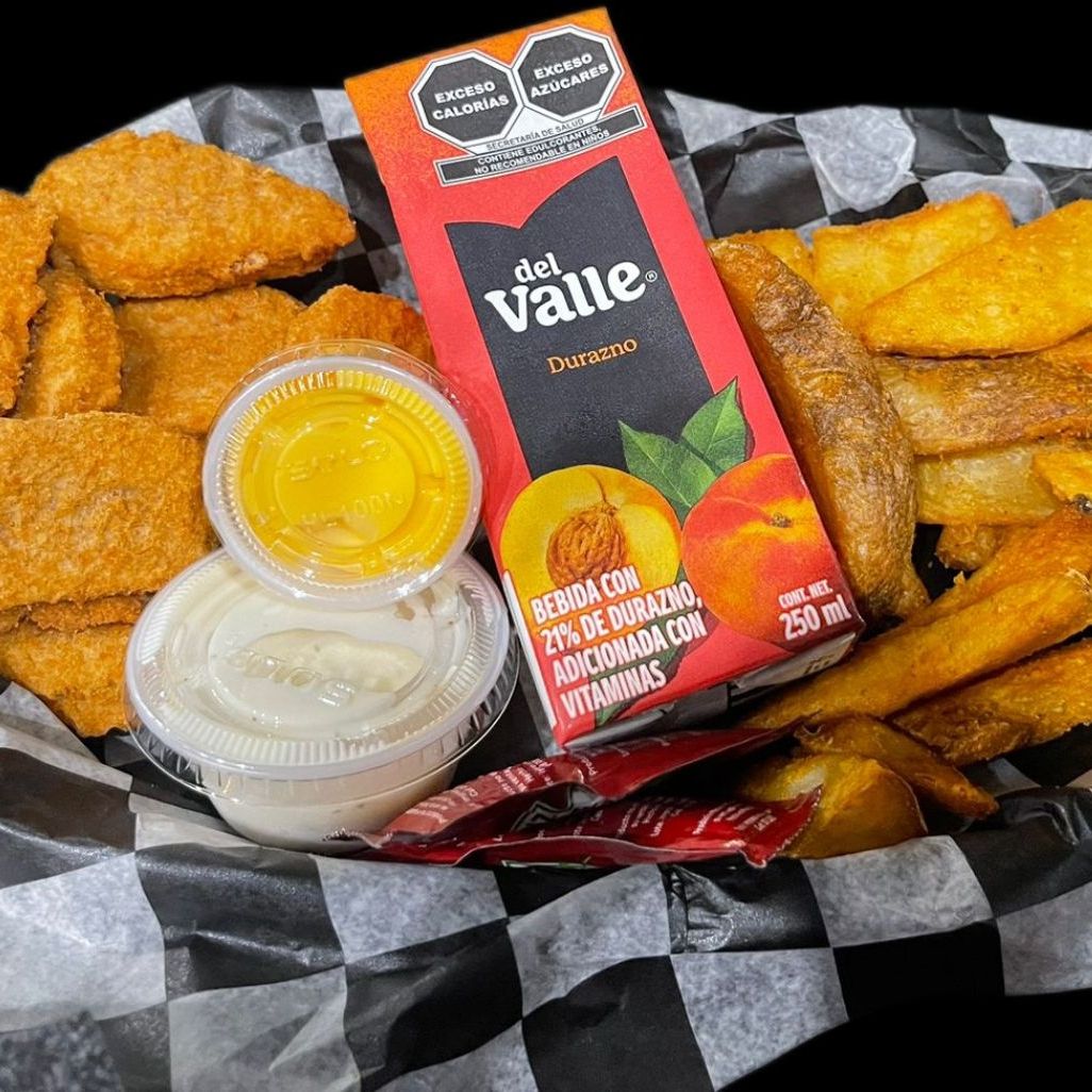 8 piezas de nuggets de pollo, a elegir papas gajo o dedos de queso, incluye bebida y dulce sorpresa