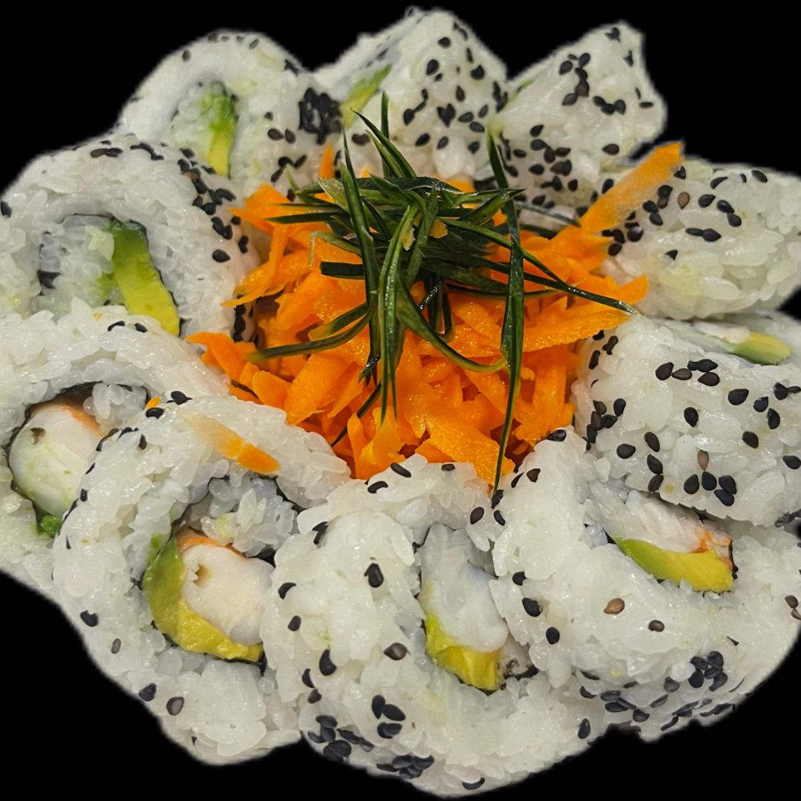 Philadelphia, aguacate, pepino y camarón por dentro, ajonjolí y tampico por encima.