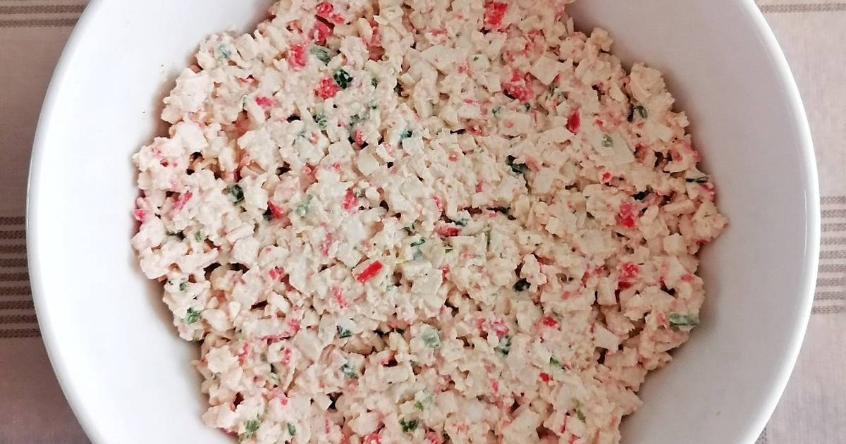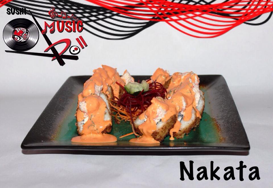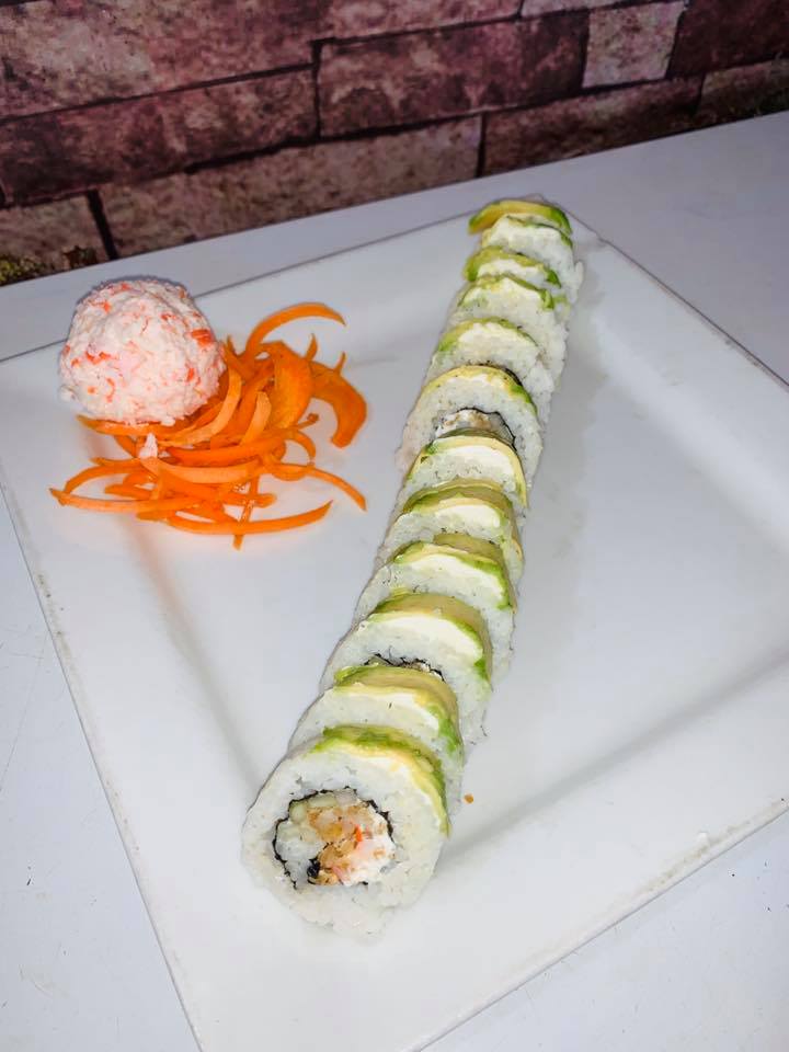 Por dentro: philadelphia, aguacate, pepino y cangrejo. Por fuera: forrado de cangrejo. Encima: aderezo de kanikama.