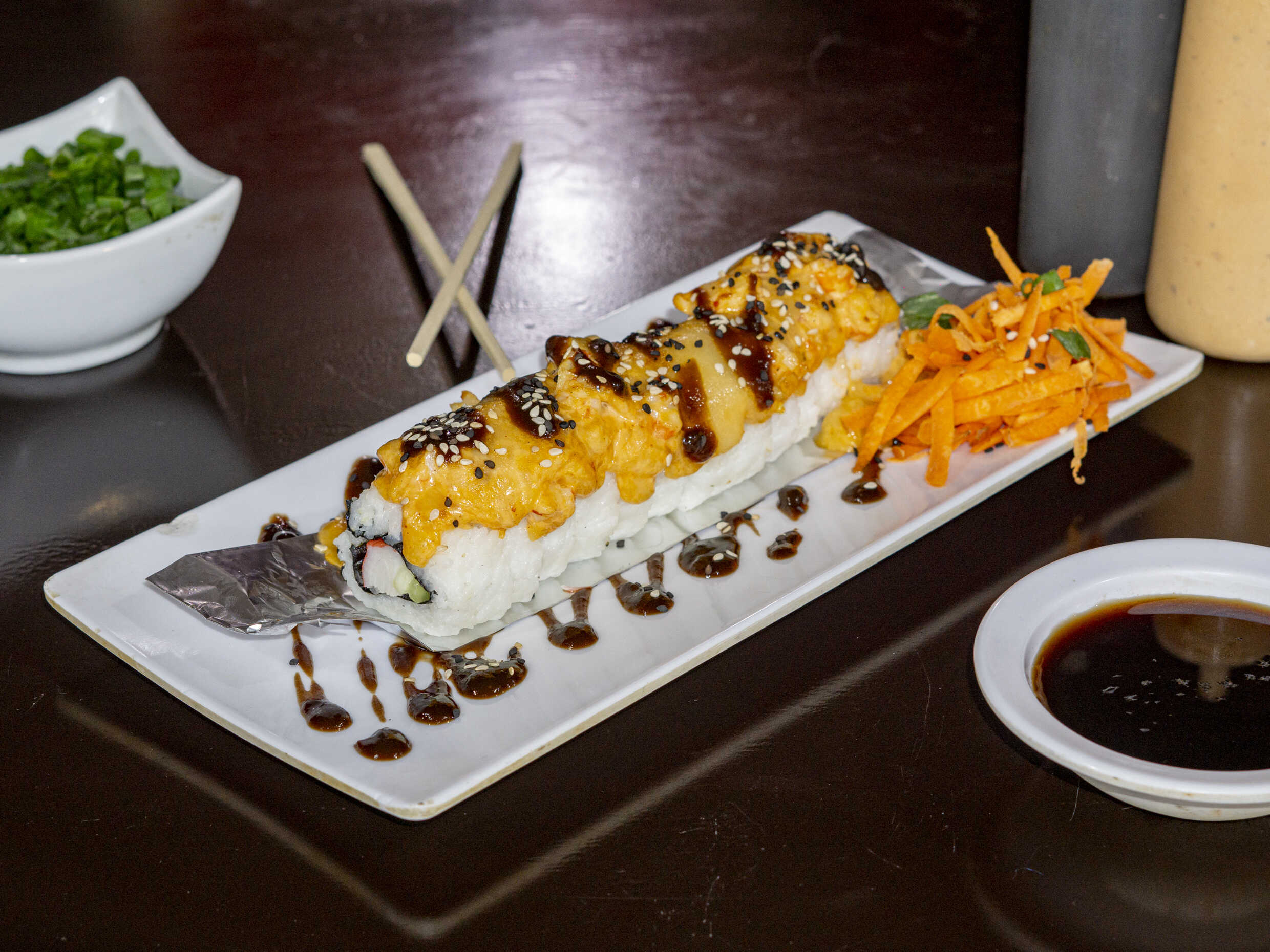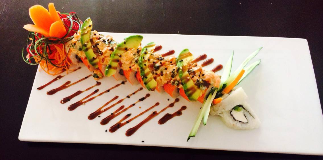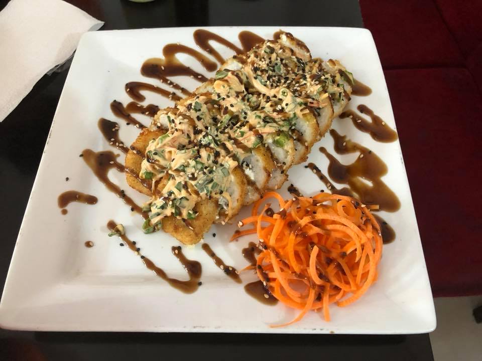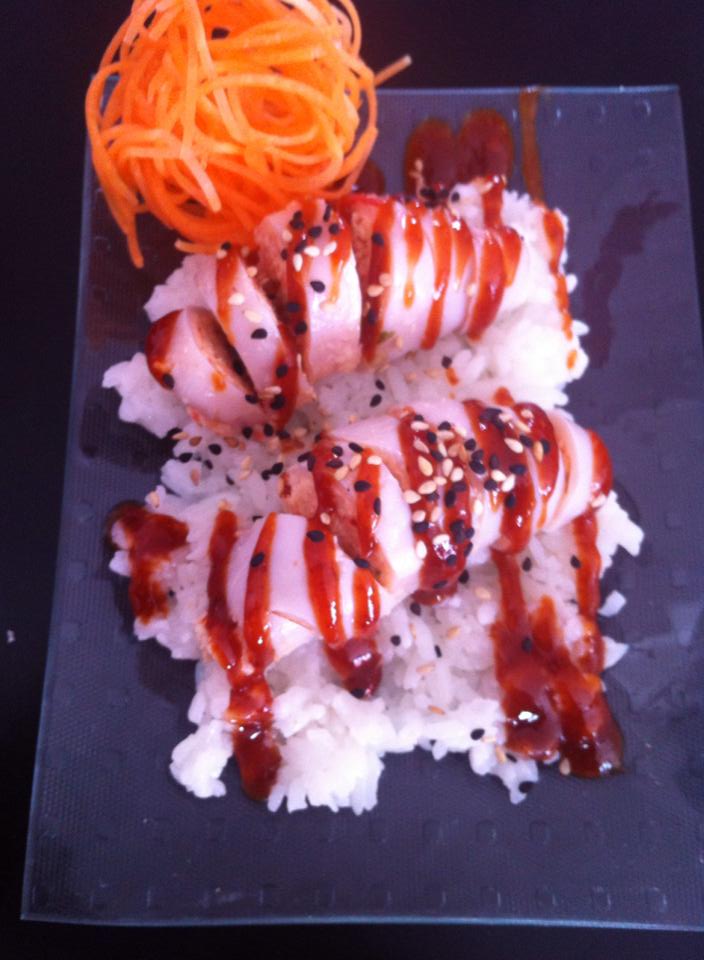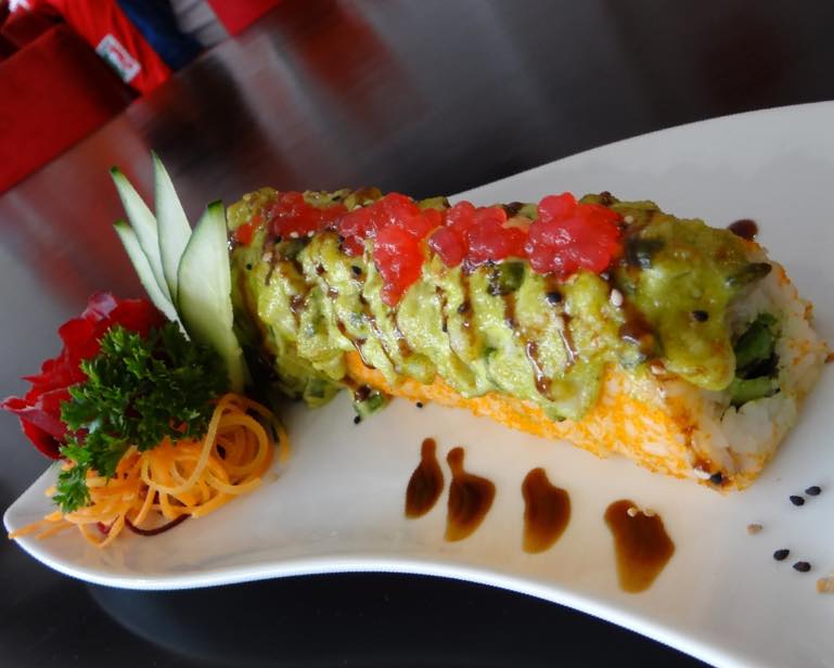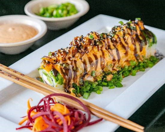 Por dentro: philadelphia, aguacate, pepino y pollo. Encima: topping de tampico bañado de aderezo de sriracha.