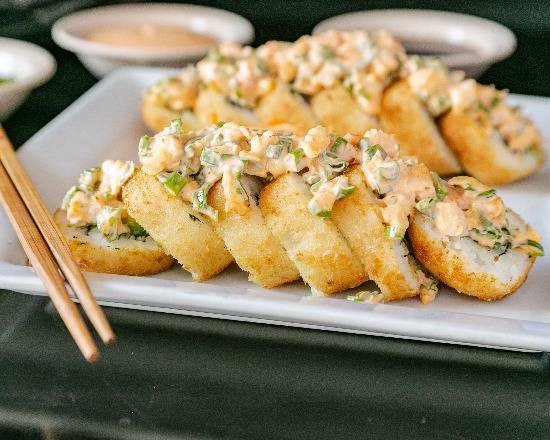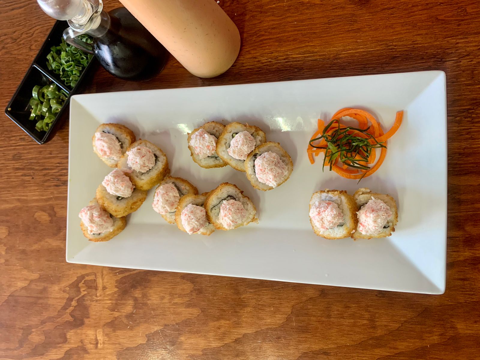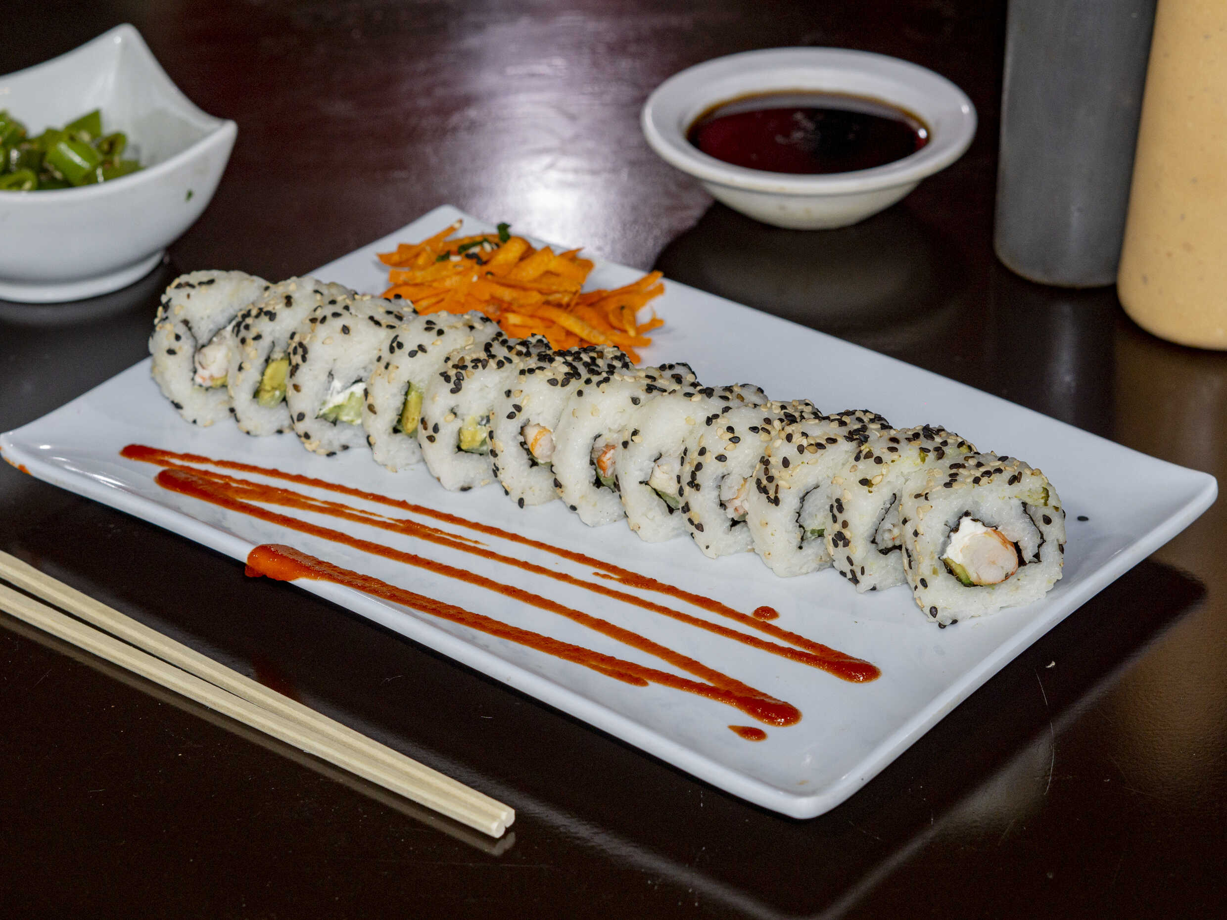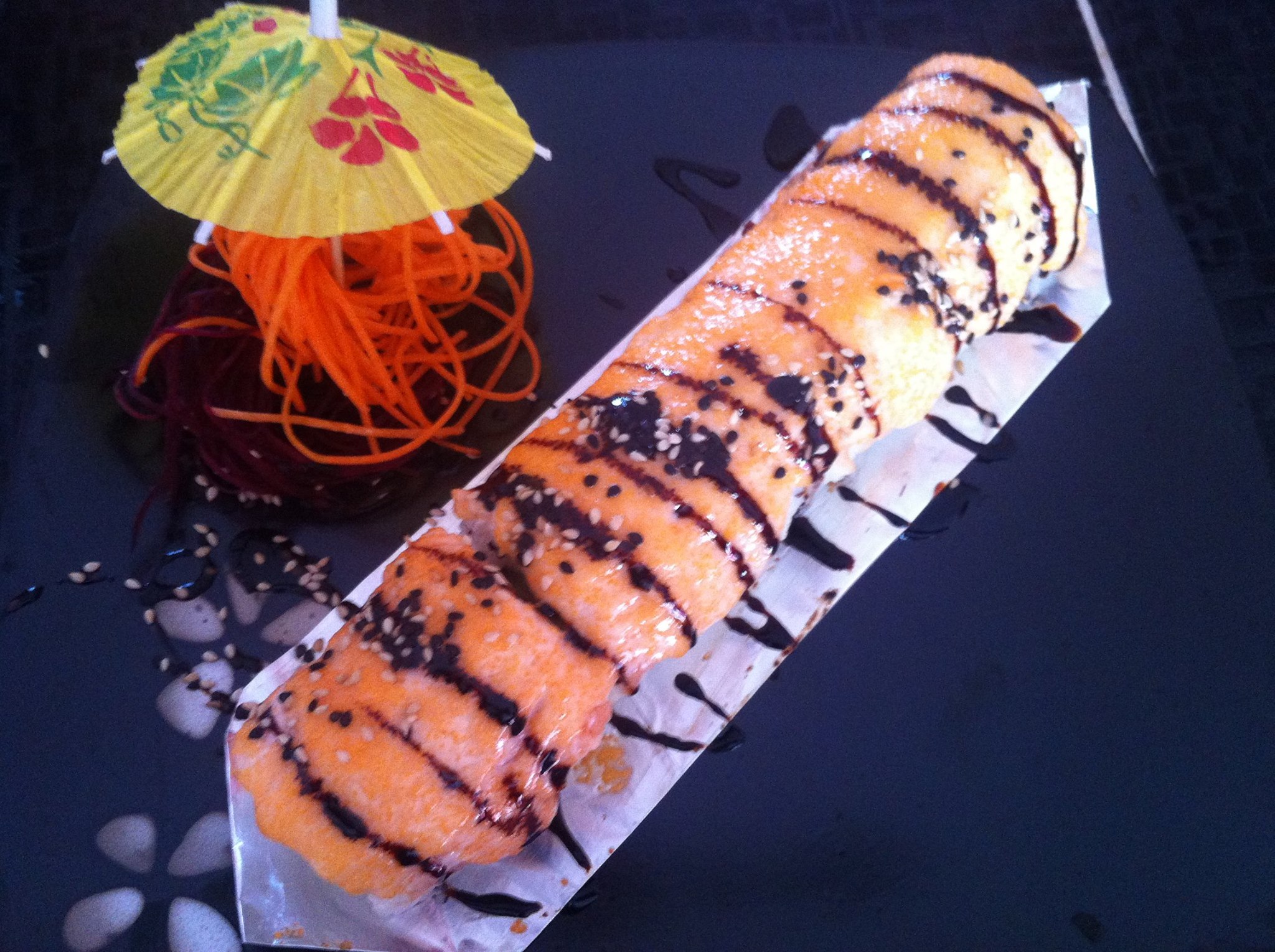 Por dentro: philadelphia, aguacate, pepino y pollo. Encima: topping de tampico bañado de aderezo de sriracha.