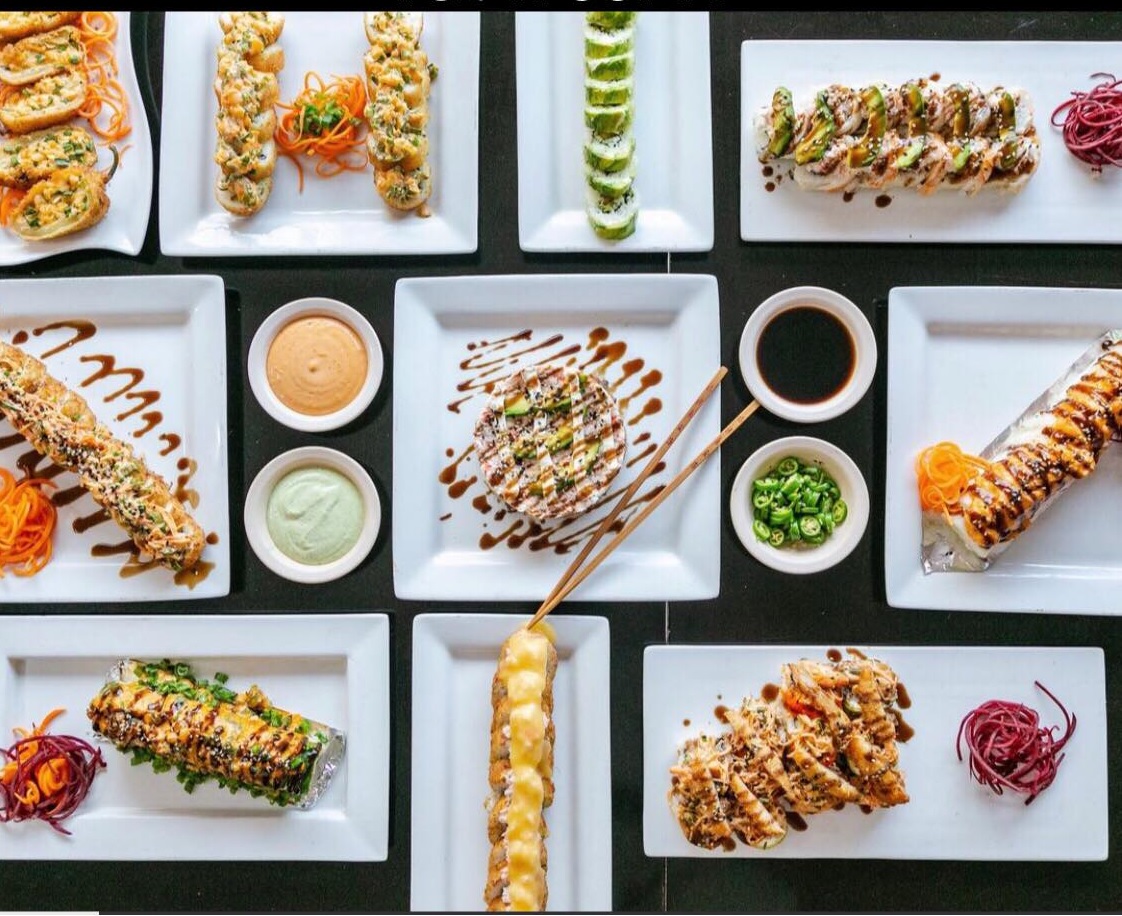 Por dentro: philadelphia, aguacate y pepino. Por fuera: salmón, atún, camarón y pulpo. Encima: Aderezos de cilantro y chipotle y salsa de anguila.