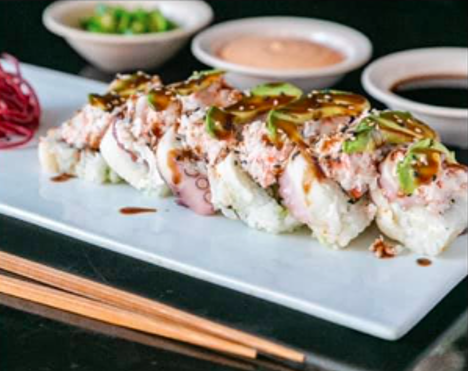 Por dentro: philadelphia, aguacate, camarón, pulpo y cangrejo. Encima: topping de tampico, bañado en salsa.