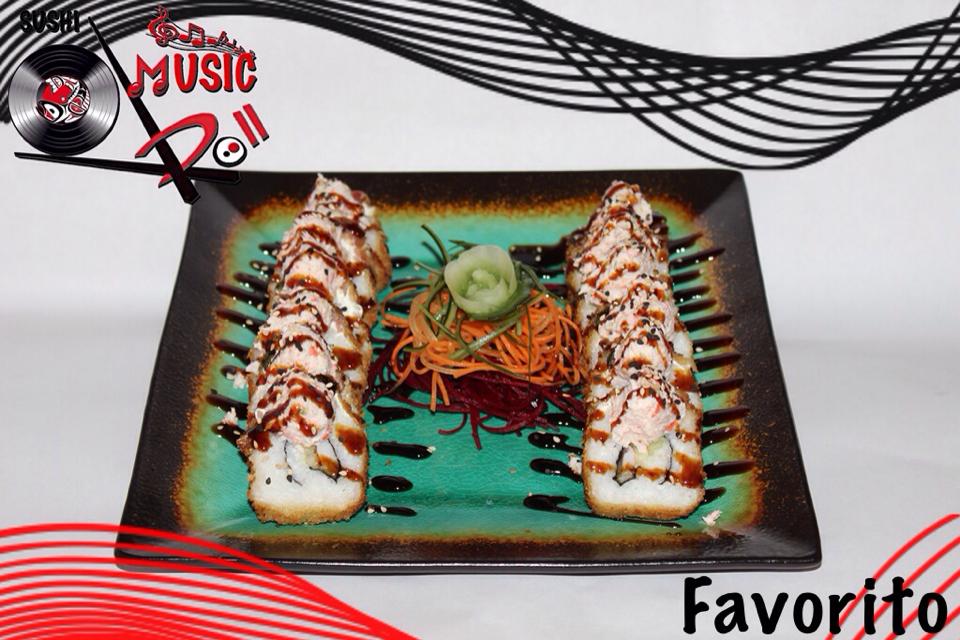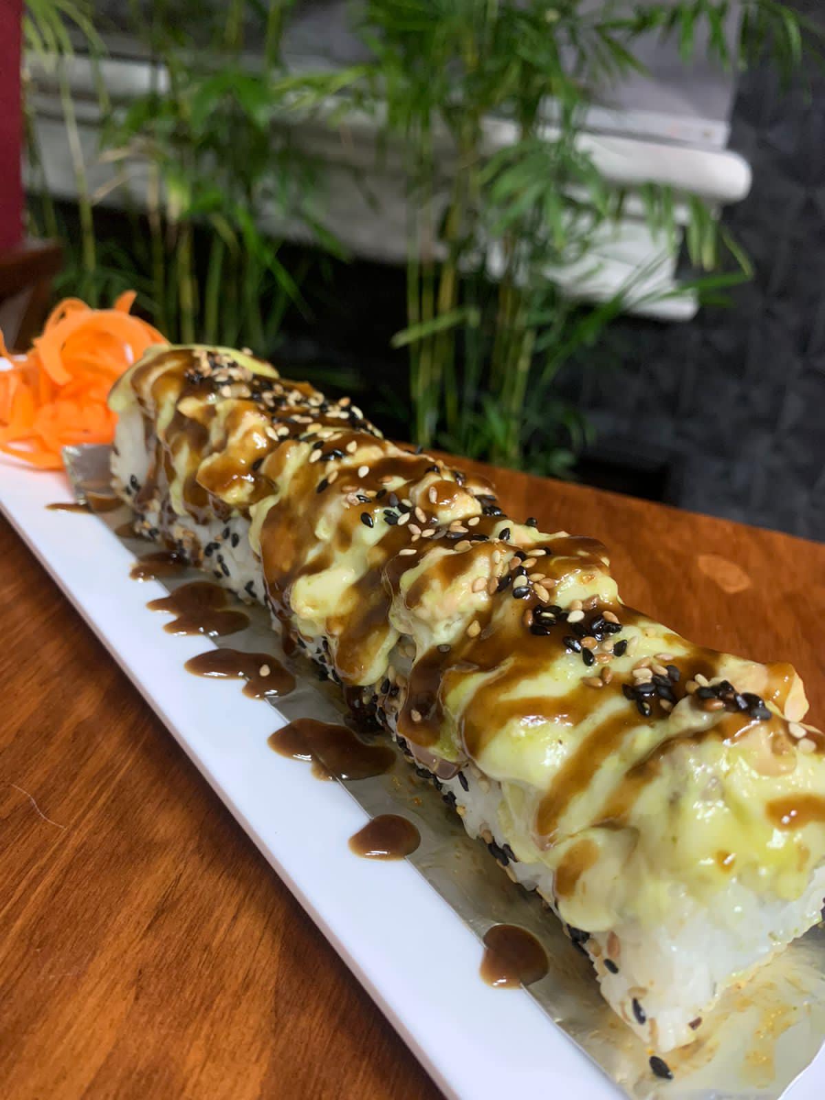 Por dentro: philadelphia, aguacate, pepino y cangrejo. Por encima: topping de tampico, bañado en salsa de anguila.
