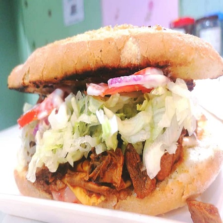Jamón, queso amarillo, crema, mayonesa, lechuga, tomate, cebolla y jalapeños.