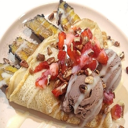 Crepa rellena de Philadelphia, plátano frito (macho) espolvoreado con azúcar canela, acompañado con nieve sabor a elegir,fresa picada chantilly,bañada en lechera y nuez.