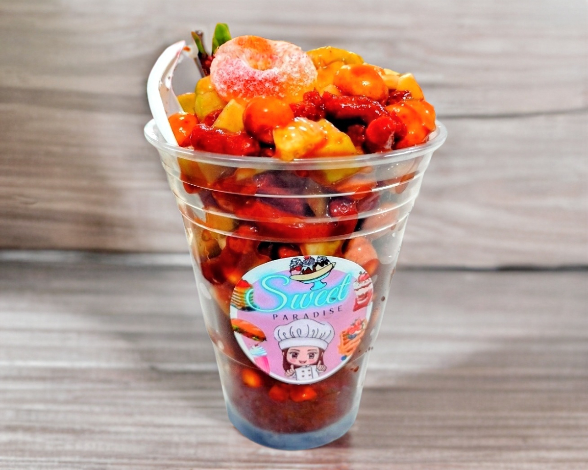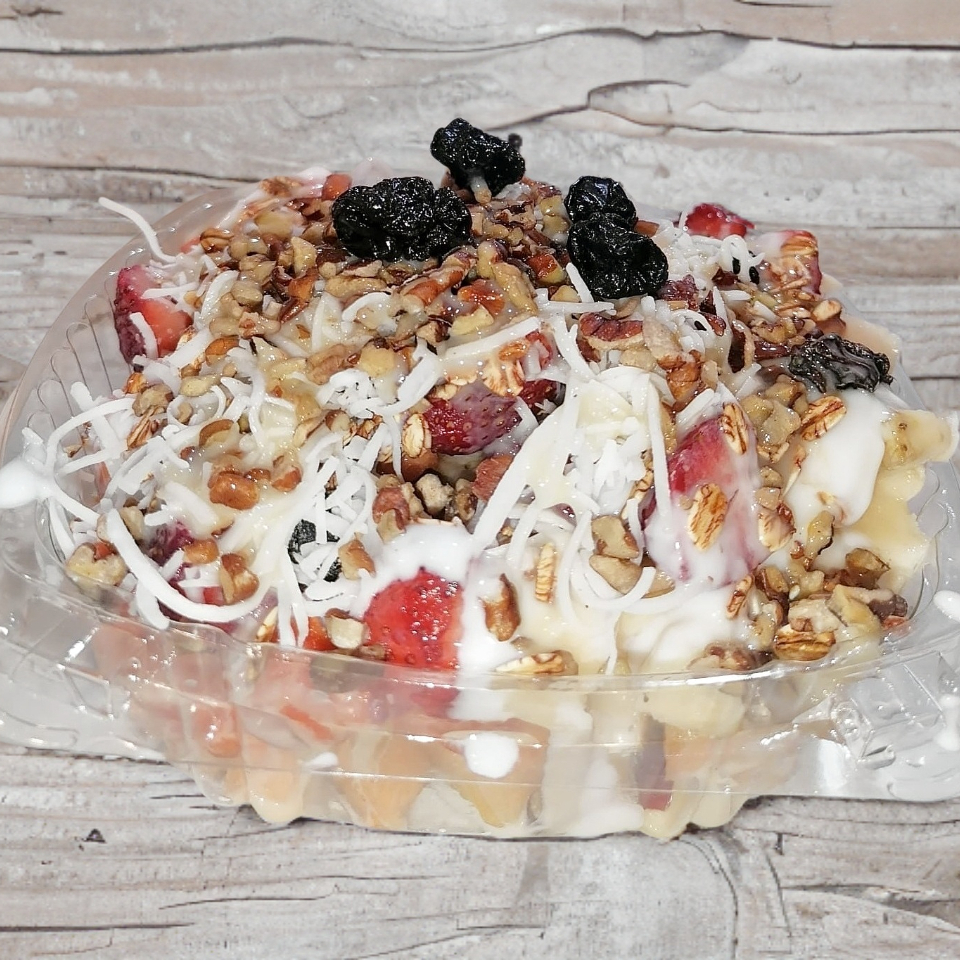 Fruta picada, una bola de nieve sabor a elegir, manzana, papaya, plátano, melón, fresa, granola, pasas, nuez y lechera.