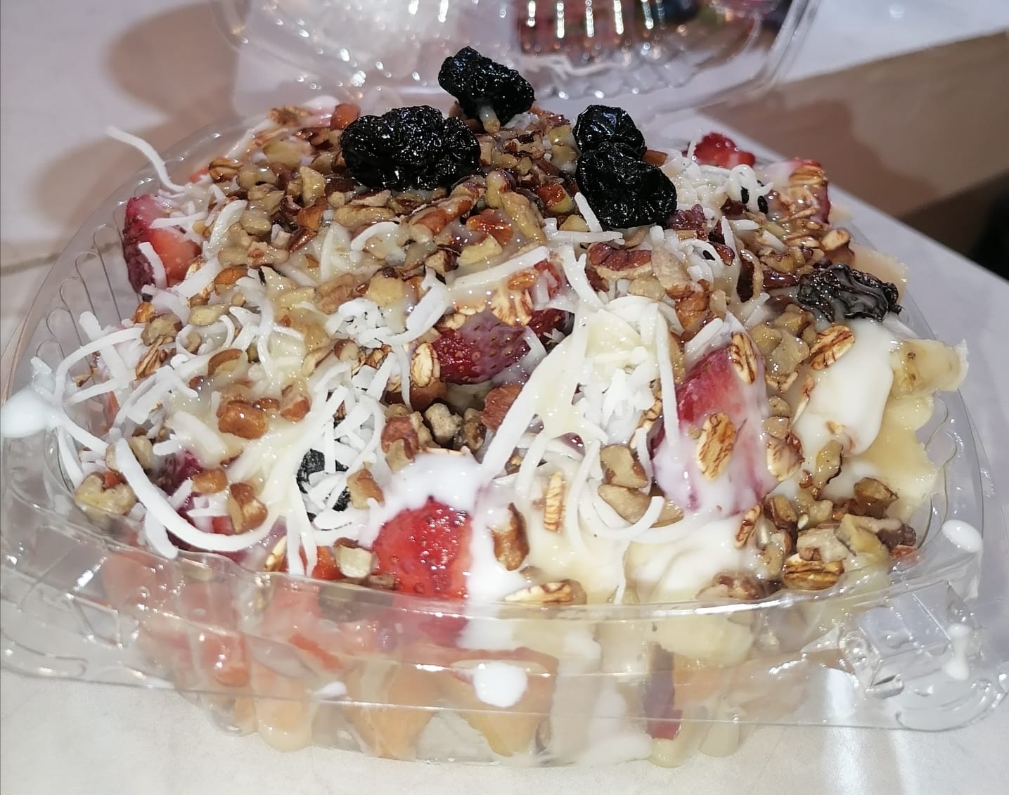 Fruta picada, manzana, papaya, plátano, melón, fresa, granola, pasas, nuez y lechera.