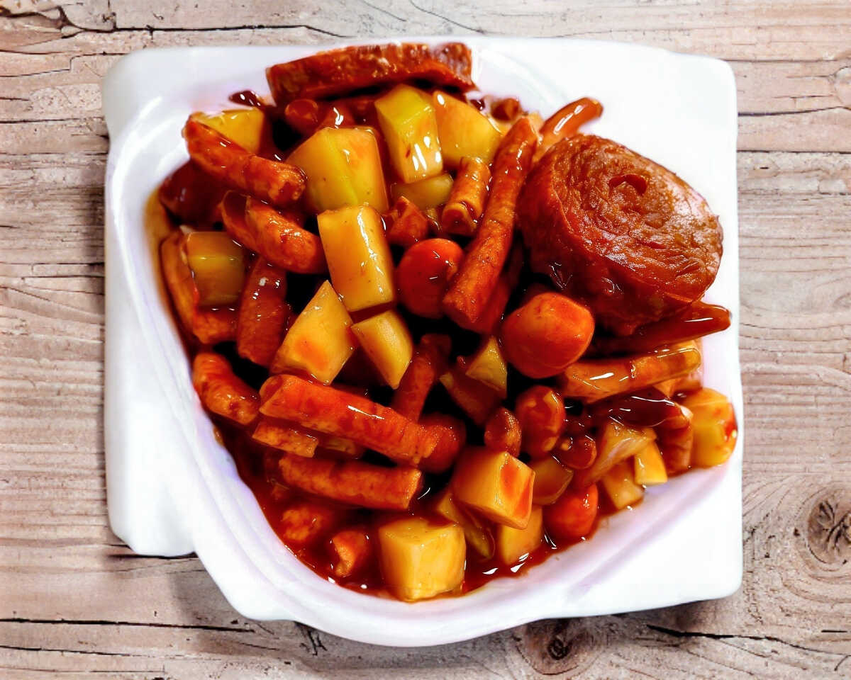 Cacahuate, pepino, chaca chaca,cueritos, tarugo de chile, y salsa especial.