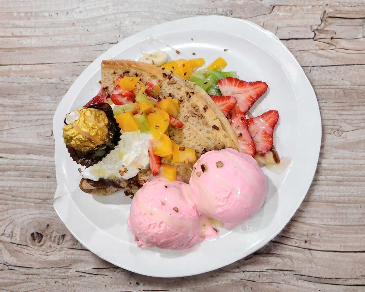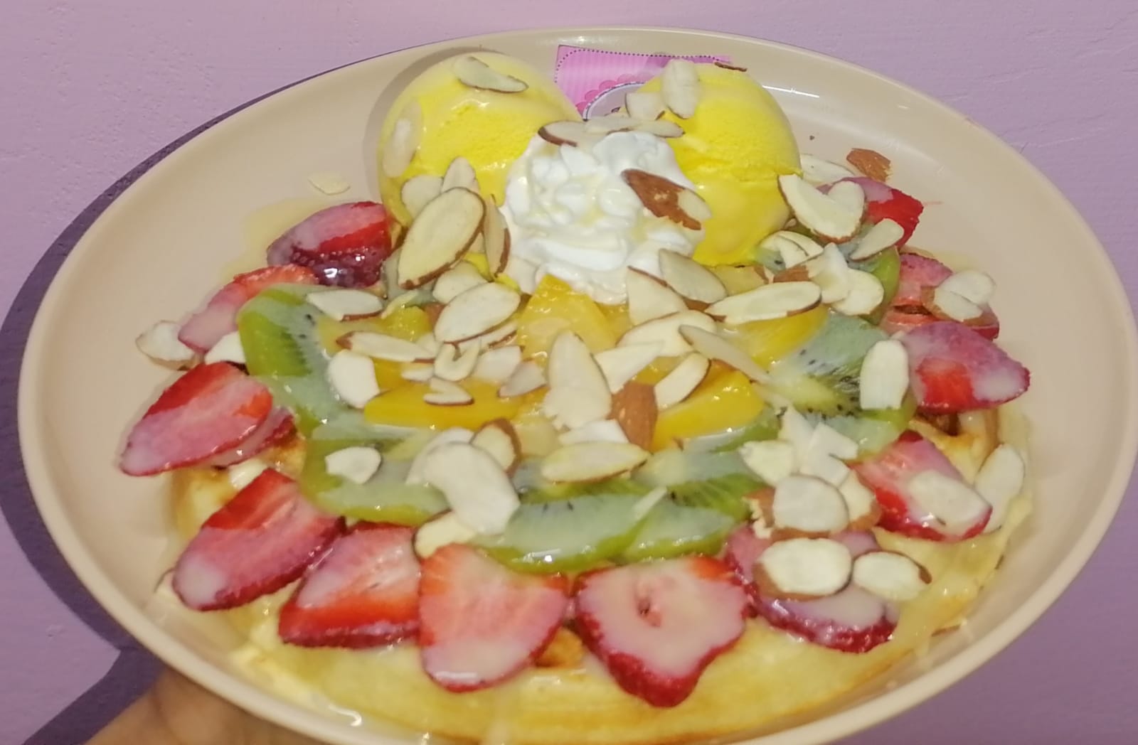 Waffle con fruta picada, fresa, kiwi, durazno, con nieve sabor a elegir, chantilly, bañado con topping de lechera y almendra.