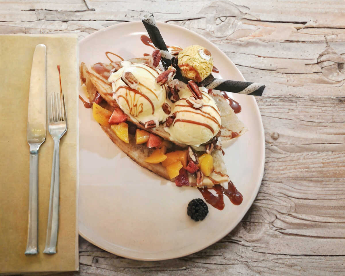 Crepa rellena de fruta, fresa, durazno, por fuera nieve sabor a elegir ,chantilly, ferrero, galleta, bañada en cajeta y nuez.