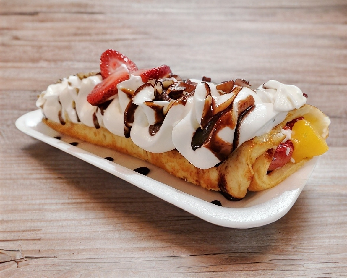 Crepas con una fruta a elección, Philadelphia, chantilly, nuez y un topping a elegir.
