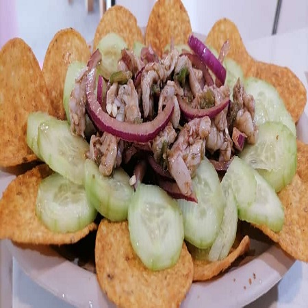 Tostitos, camarón crudo, pepino, cebolla morada y salsa especial de la casa.
