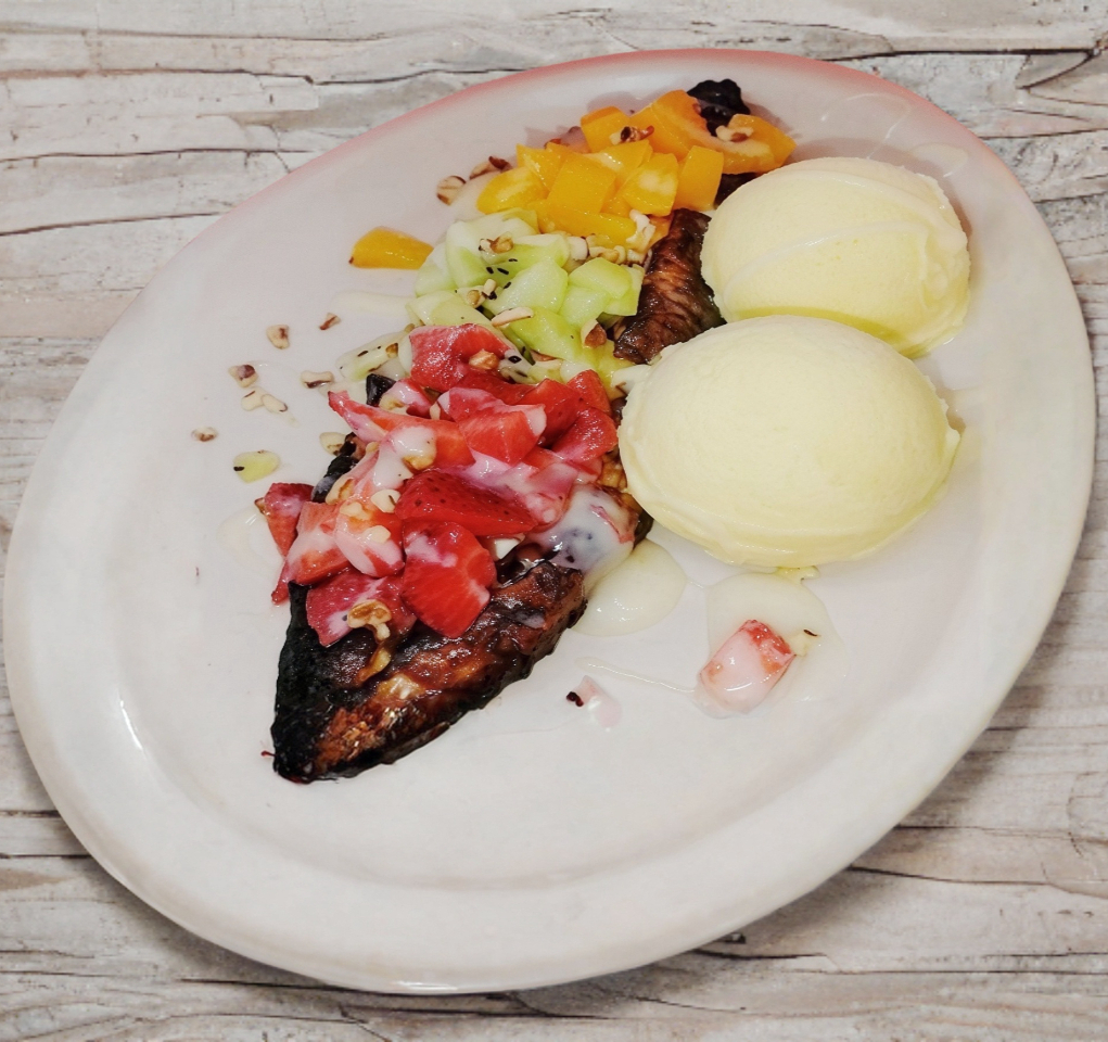 Platano frito macho relleno de Philadelphia con relleno de fruta picada (fresa,kiwi,durazno) nuez ,lechera y una bola de nieve sabor a elegir.