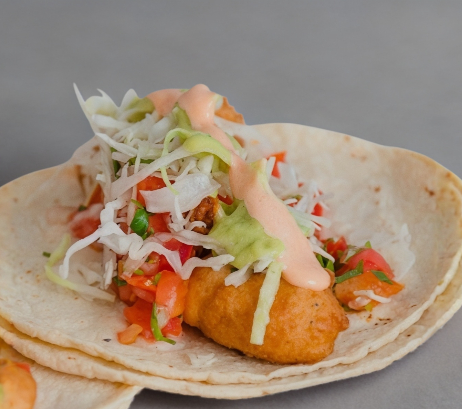 Tortilla de harina jumbo con queso, pescado capeado, repollo, pico de gallo, frijoles y aderezo especial de la casa. (Imagen contiene costra de queso con un costo extra).