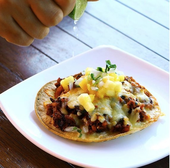 Gordita de maíz con asientos de chicharrón de puerco, queso gratinado y carne al pastor.