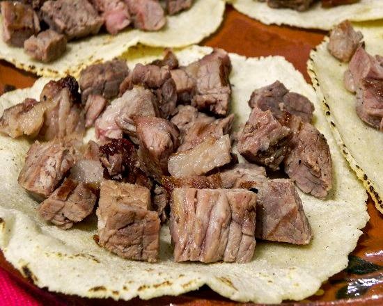 Carne de puerco adobada, cada uno tortilla de harina con cebolla y cilantro.