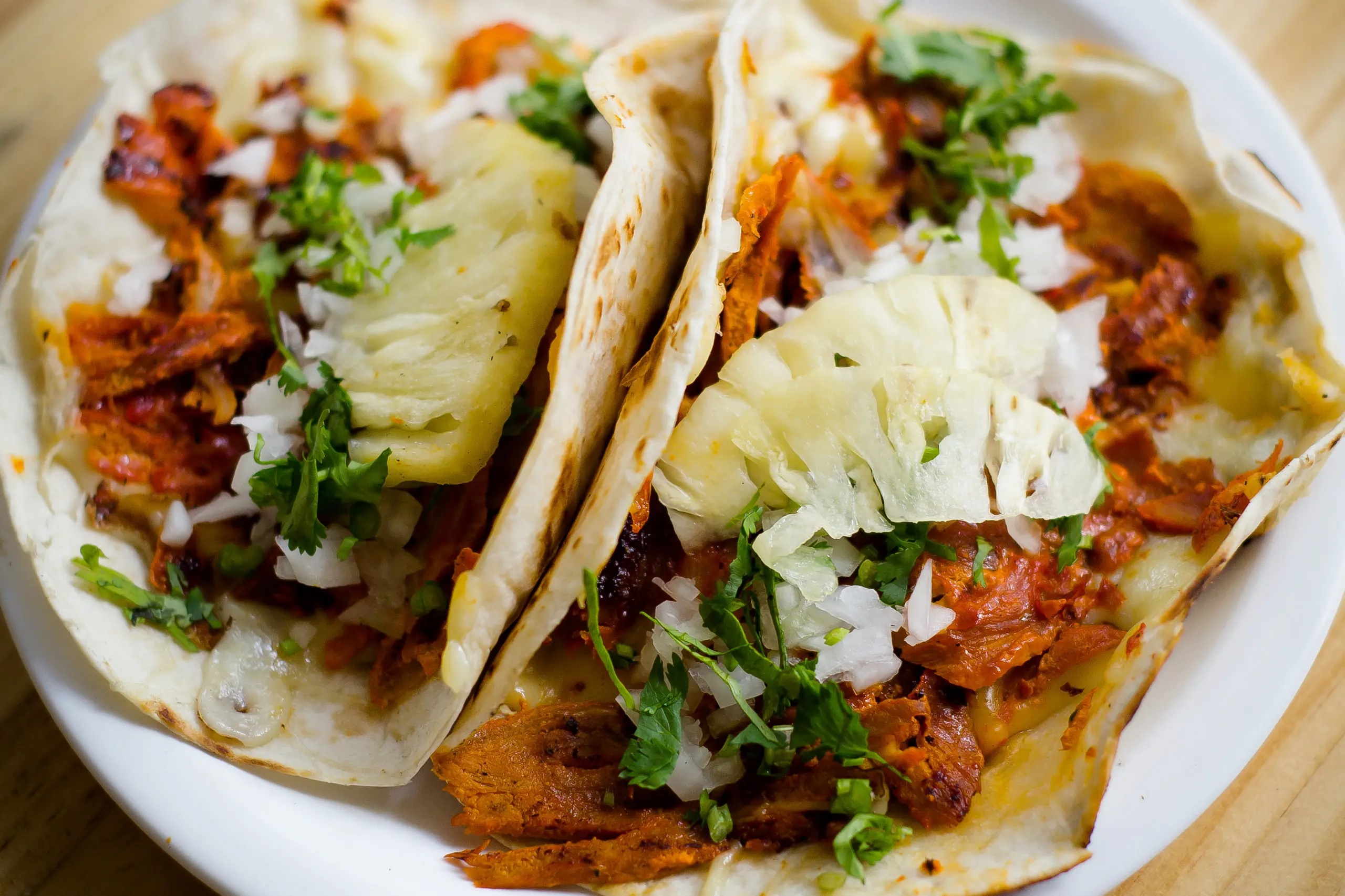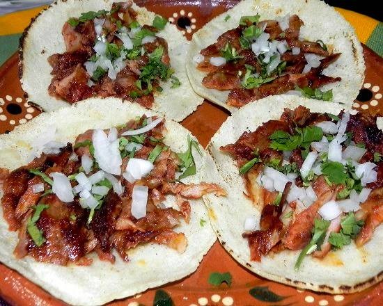 Carne de puerco adobada, hechos con tortilla de maíz, con cilantro y cebolla.