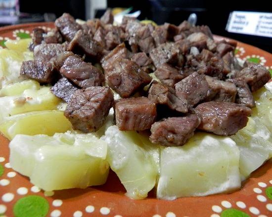 Papa al horno, con crema de la casa, bañada con queso chihuahua y carne, cada orden va acompañada de 7 tortillas de maíz.