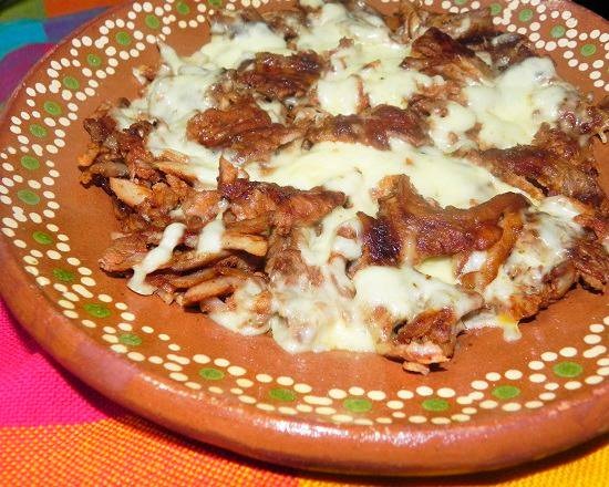 Gordita de maíz con asientos de chicharrón de puerco, queso gratinado y carne asada.