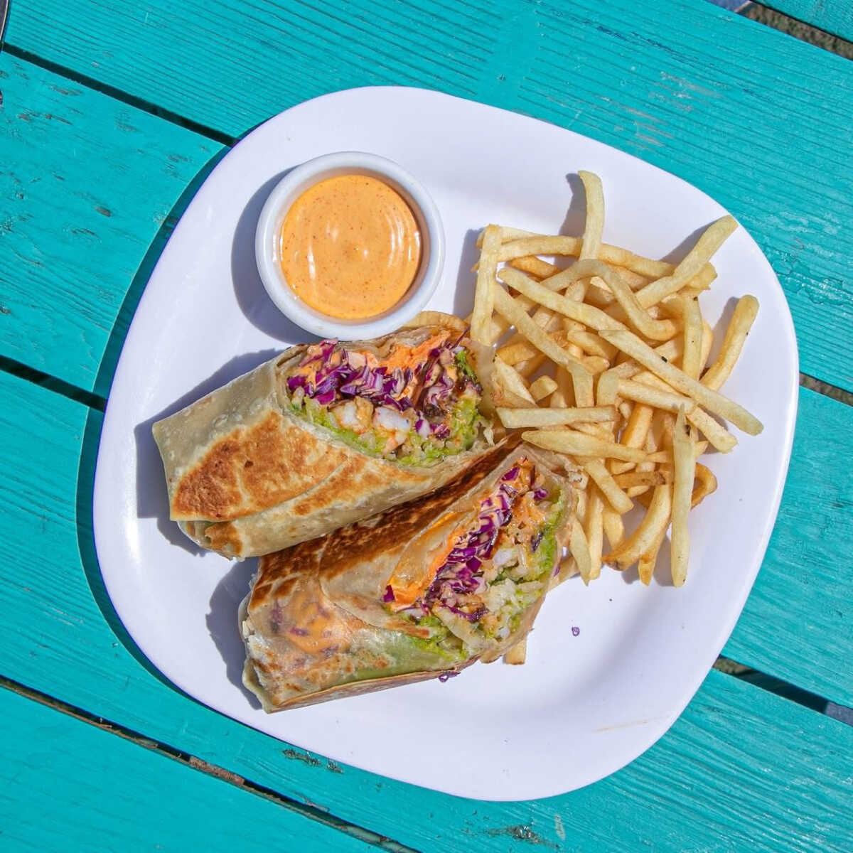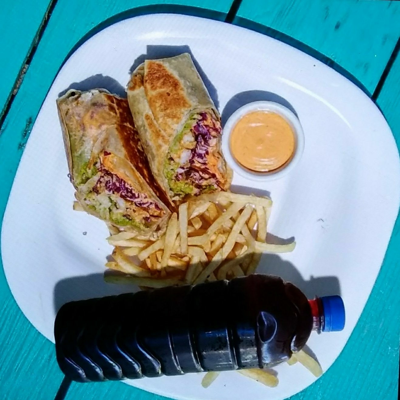 Quesadilla de harina gigante, rellena de camaron, pescado y pulpo capeado, con verduras y aderezo de la casa.