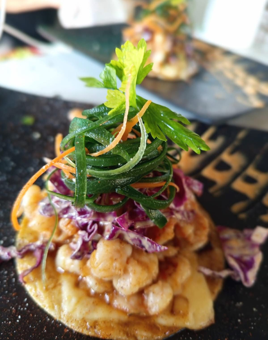 Camarón con queso gratinado y crujiente, servido en tortilla.