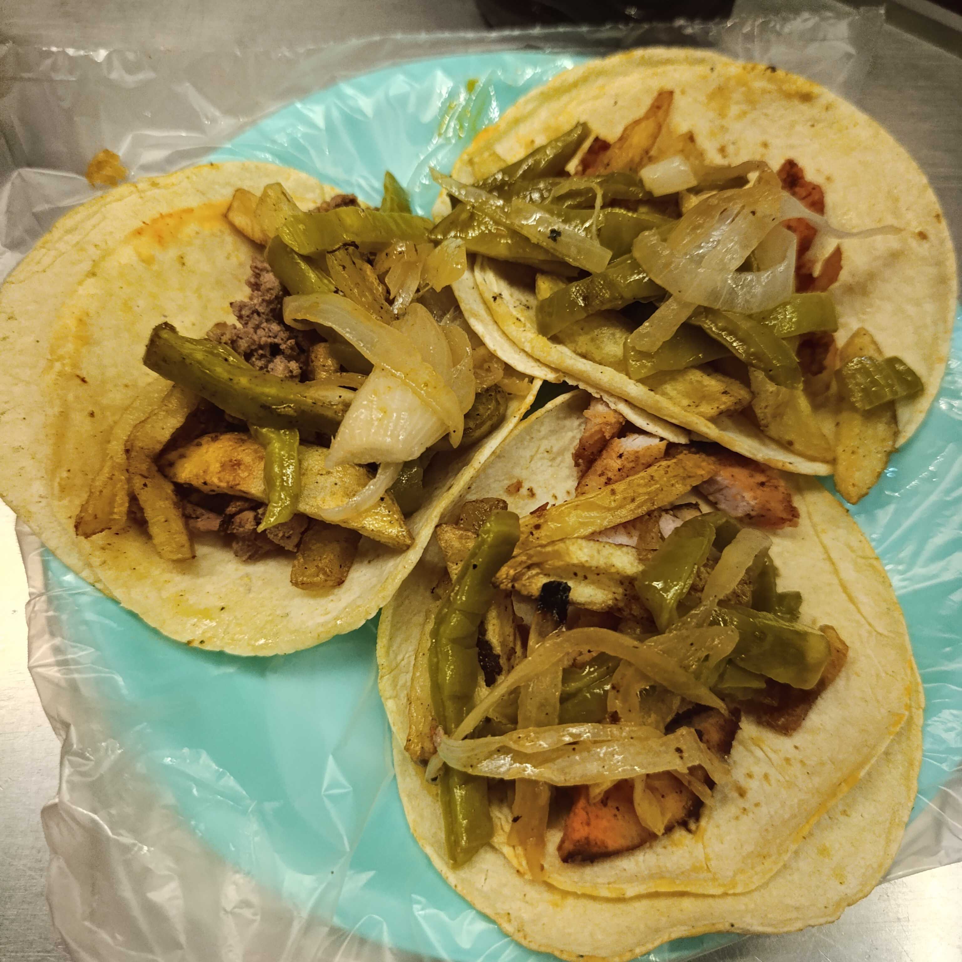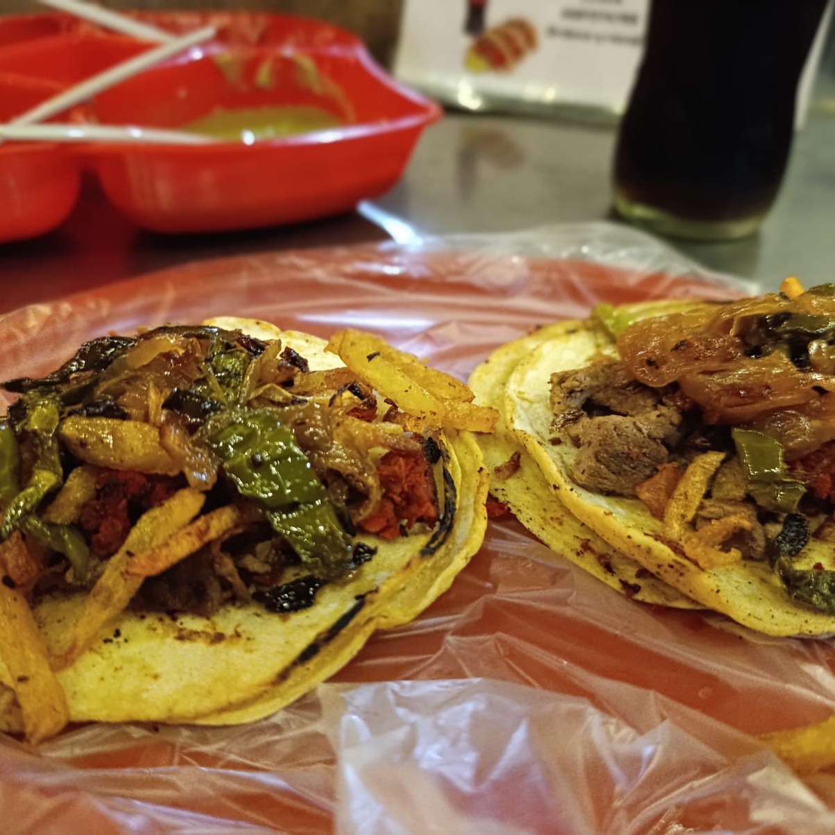 Taco de maiz, carne de res tipo asada acompañado de papa fritas, cebolla y nopales asados