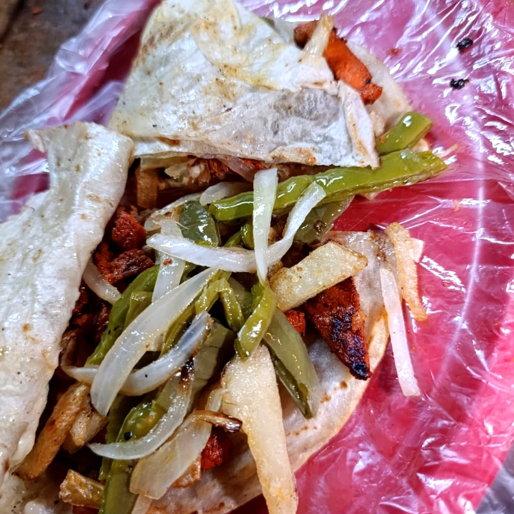 Tortilla de harina rellena de carnes de tu elección acompañada de queso cebolla asada Nopala y sus papas a la francesa