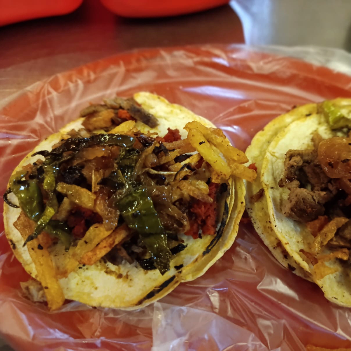 Taco de maiz, longaniza de cerdo acompañado de papas fritas, cebolla y nopales asados