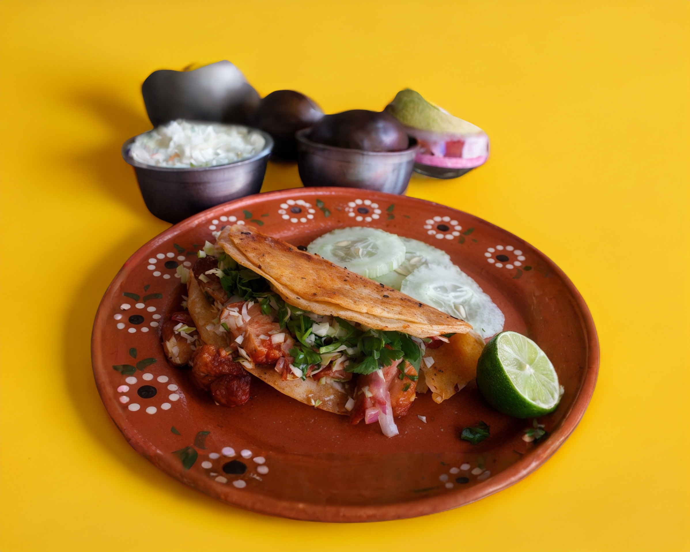 Doble tortilla de maíz rellena de chicharrón y queso manchego dorado al comal. No te lo puedes perder!