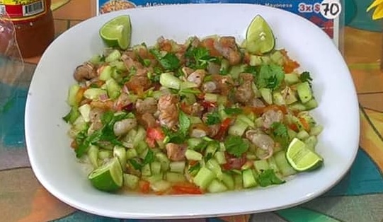 Camarón crudo y cocido, pepino, cebolla morada, bañado en salsa de chile serrano y chile morita.