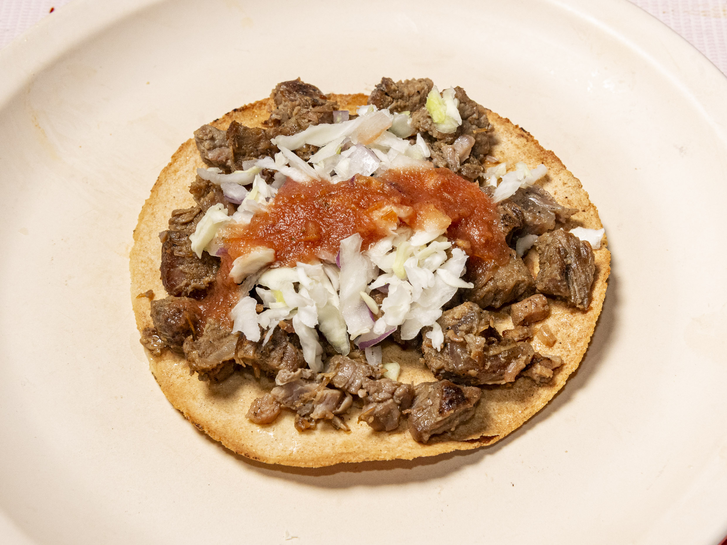 Tortilla dorada con carne de asada, repollo y cebolla morada.