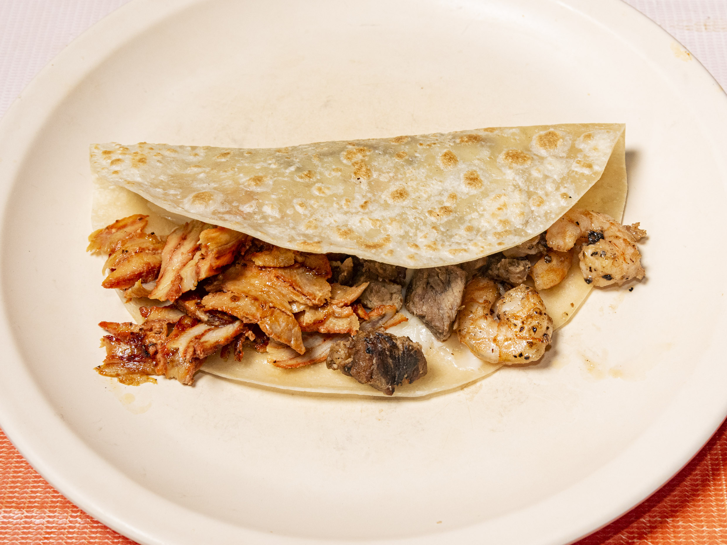 Tortilla de harina, queso Oaxaca derretido, con carne asada, pastor, camaron, cebolla morada morada y repollo.