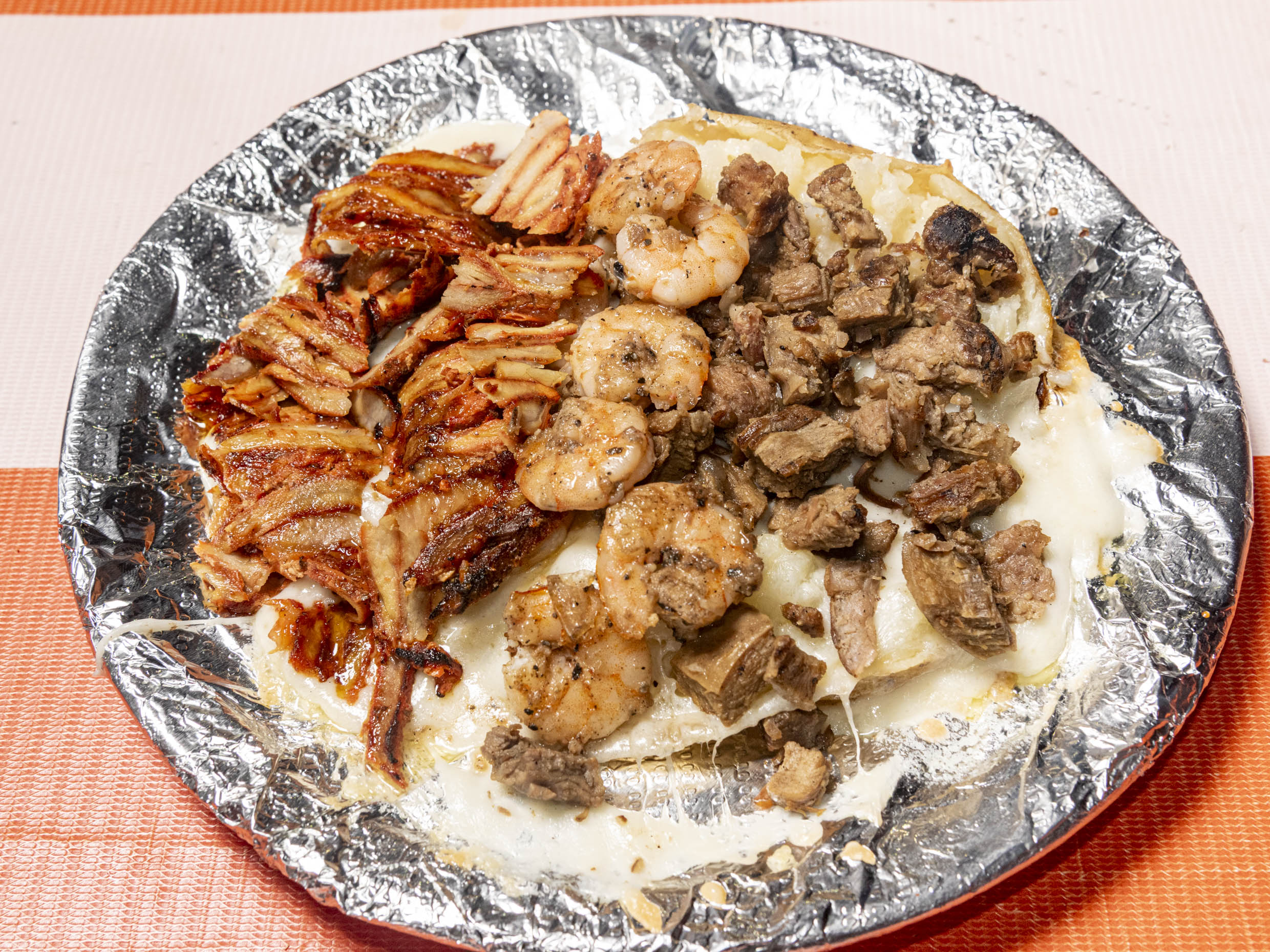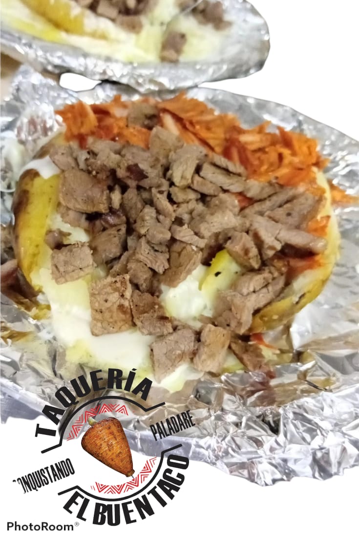 Papá con mantequilla, queso derretido oaxaca, carne asada, pastor y camaron.