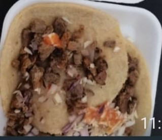 Tortilla de maíz.con queso derretido y carne asada repollo y cebolla morada