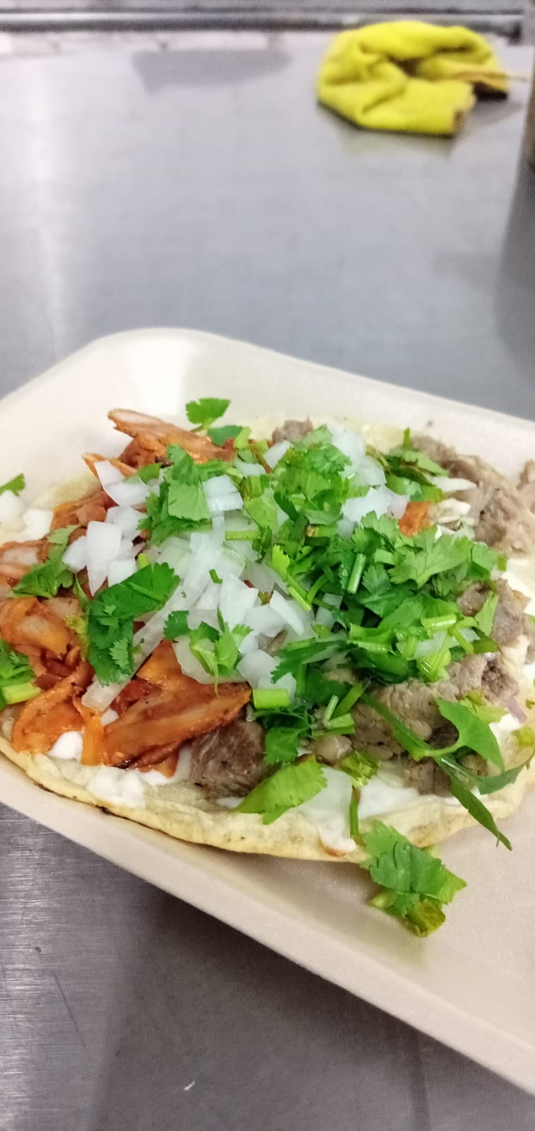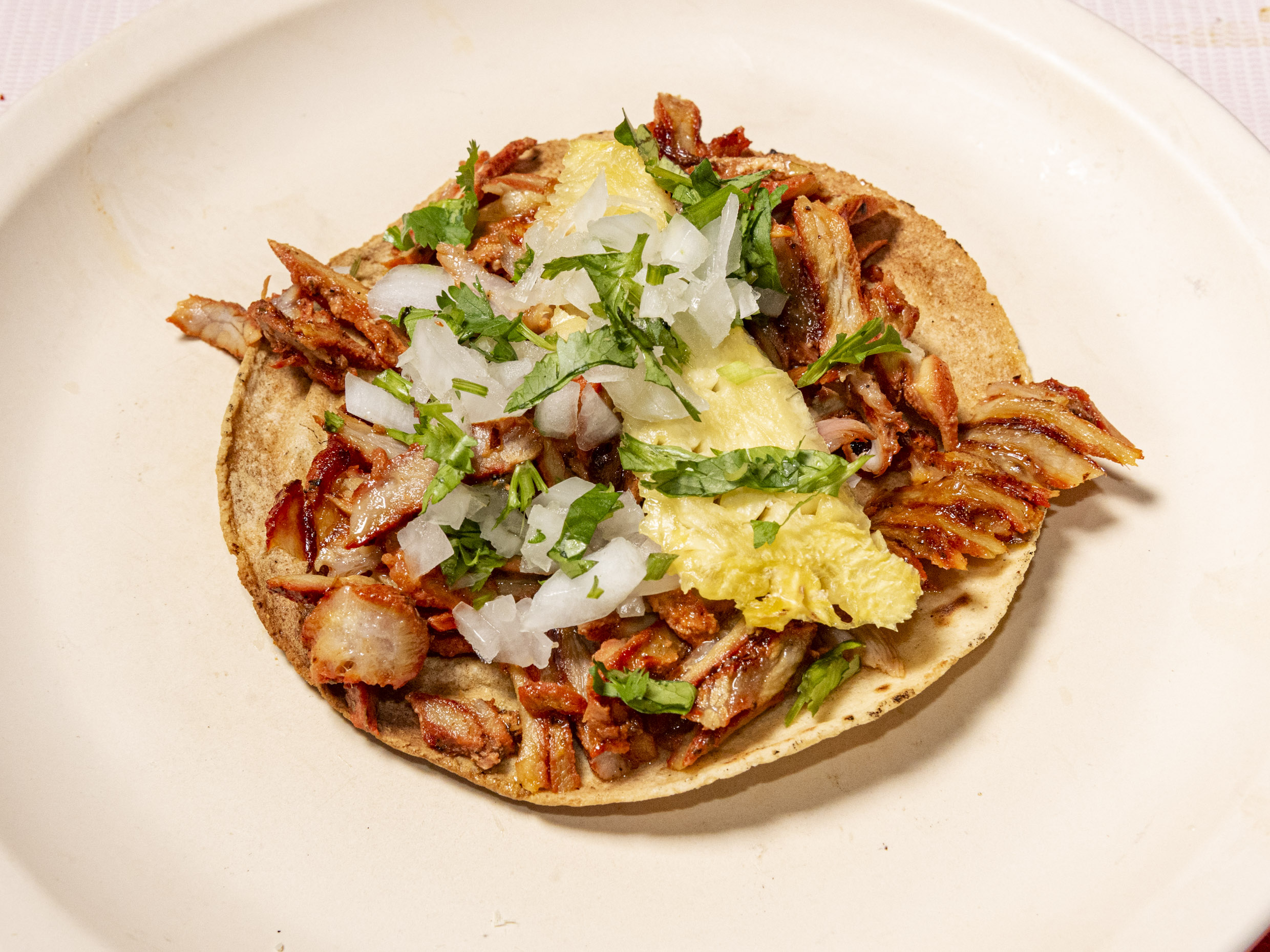 Tortilla dorada, carne de pastor, cilantro y cebolla blanca
