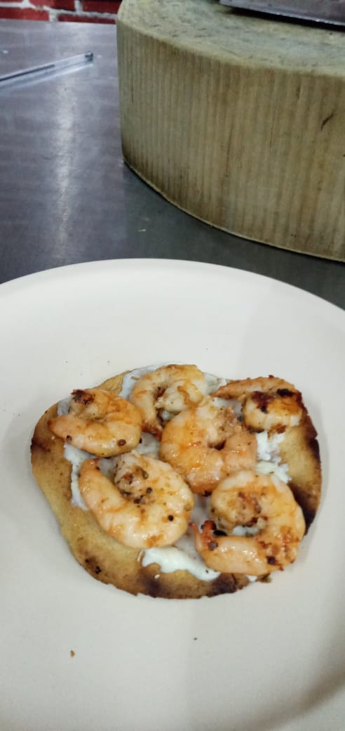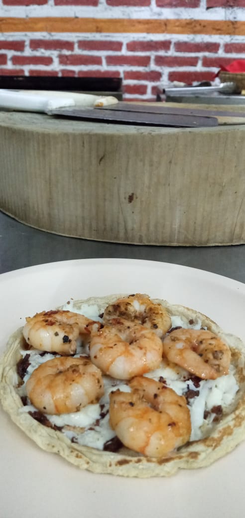Tortilla dorada con queso Oaxaca derretido, camarones marinados con mantequilla en la plancha, cebolla y repollo.