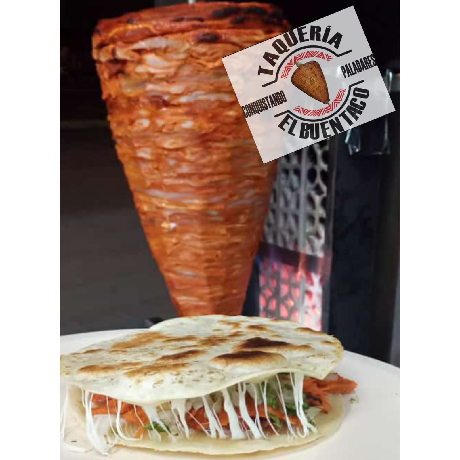 Tortilla de harina o maíz con queso derretido y carne de pastor (adobada).