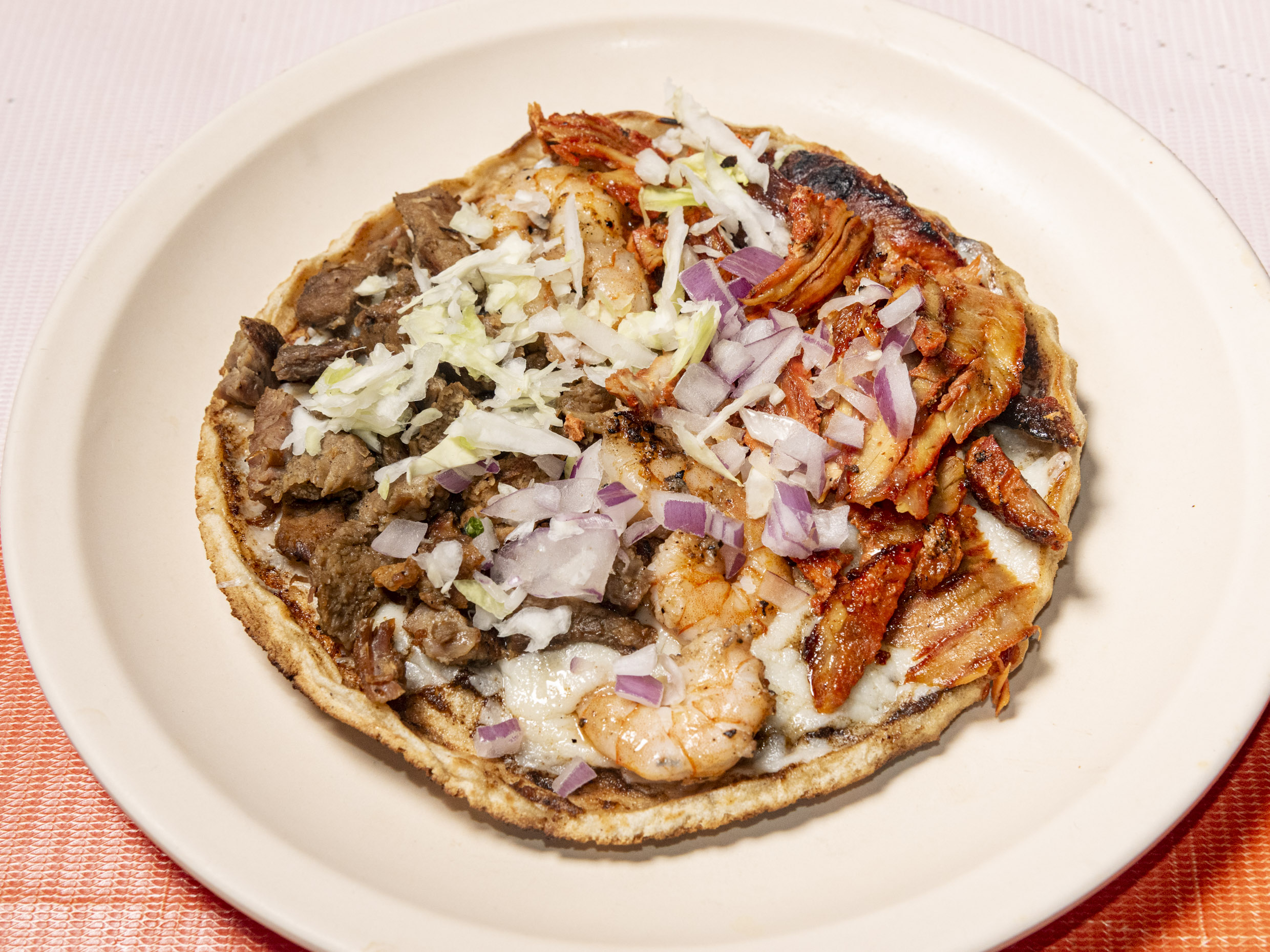 Tortilla de maíz con queso Oaxaca derretido, carne asada, pastor, camaron, cebolla morada y repollo.