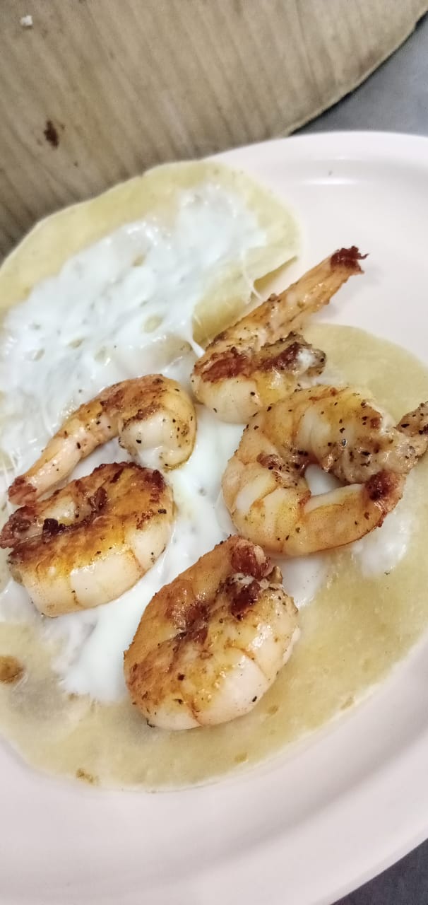 Tortilla de harina con queso Oaxaca, camarones marinados con mantequilla en la plancha, cebolla y repollo.
