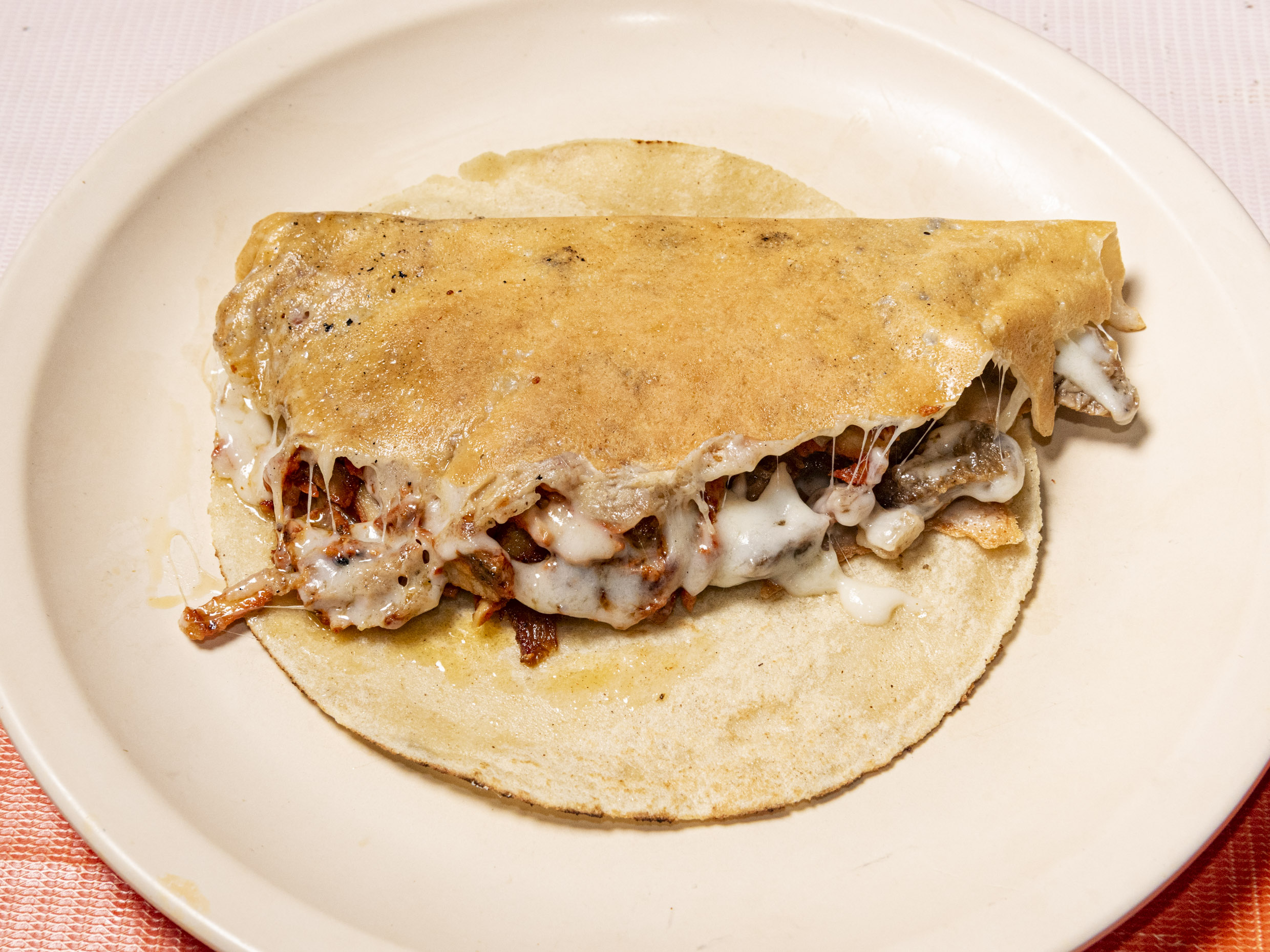 Tortilla de maíz echa a mano con queso Oaxaca y carne de pastor (cerdo) cilantro y cebolla blanca