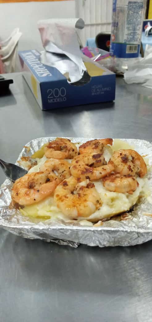 Papá en trozos (no pure) con mantequilla y queso Oaxaca derretido, camarones marinados con mantequilla ala plancha cebolla, repollo y 5 tortillas.