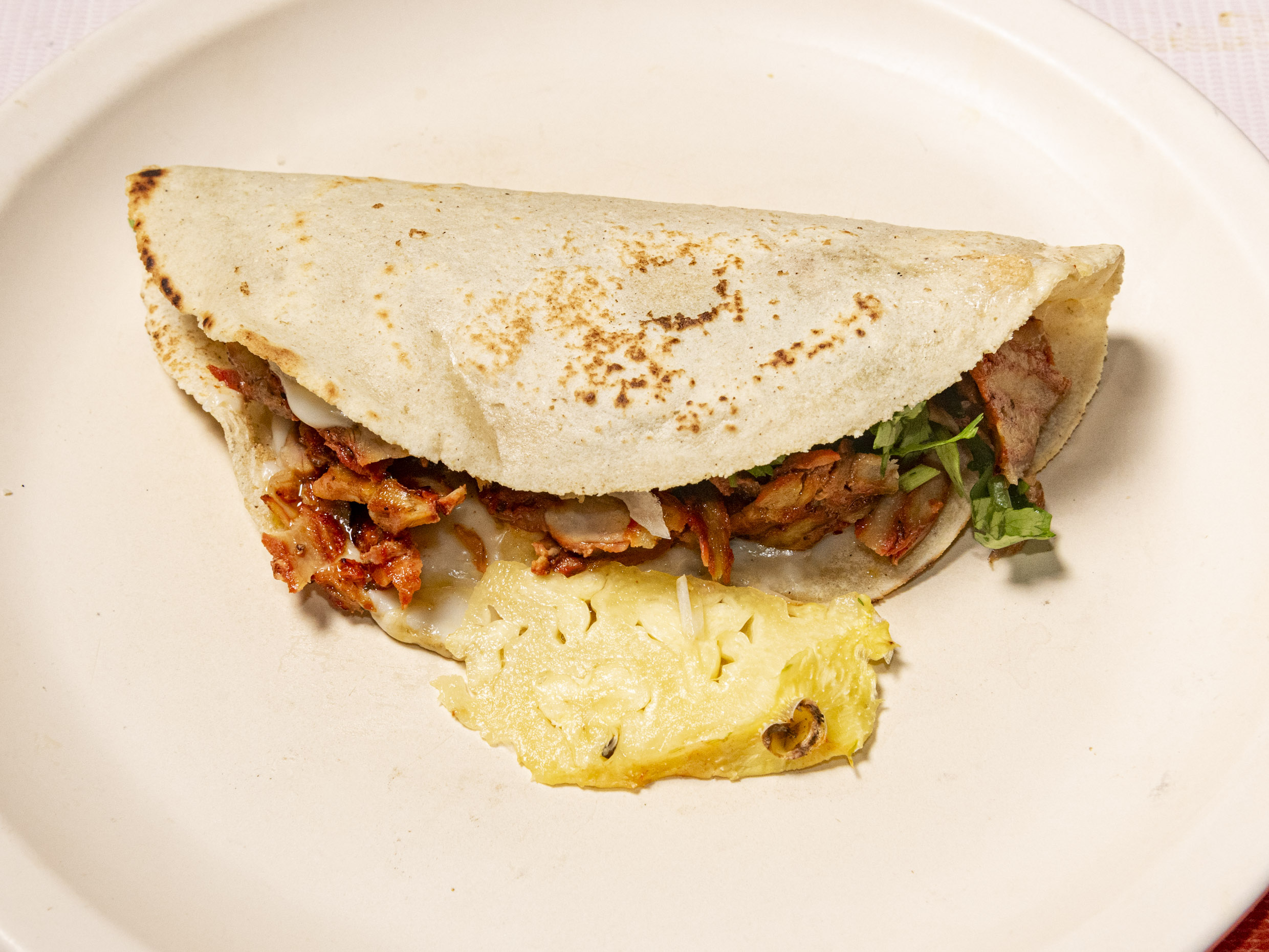Tortilla con costra ( queso derretido) con carne de pastor.